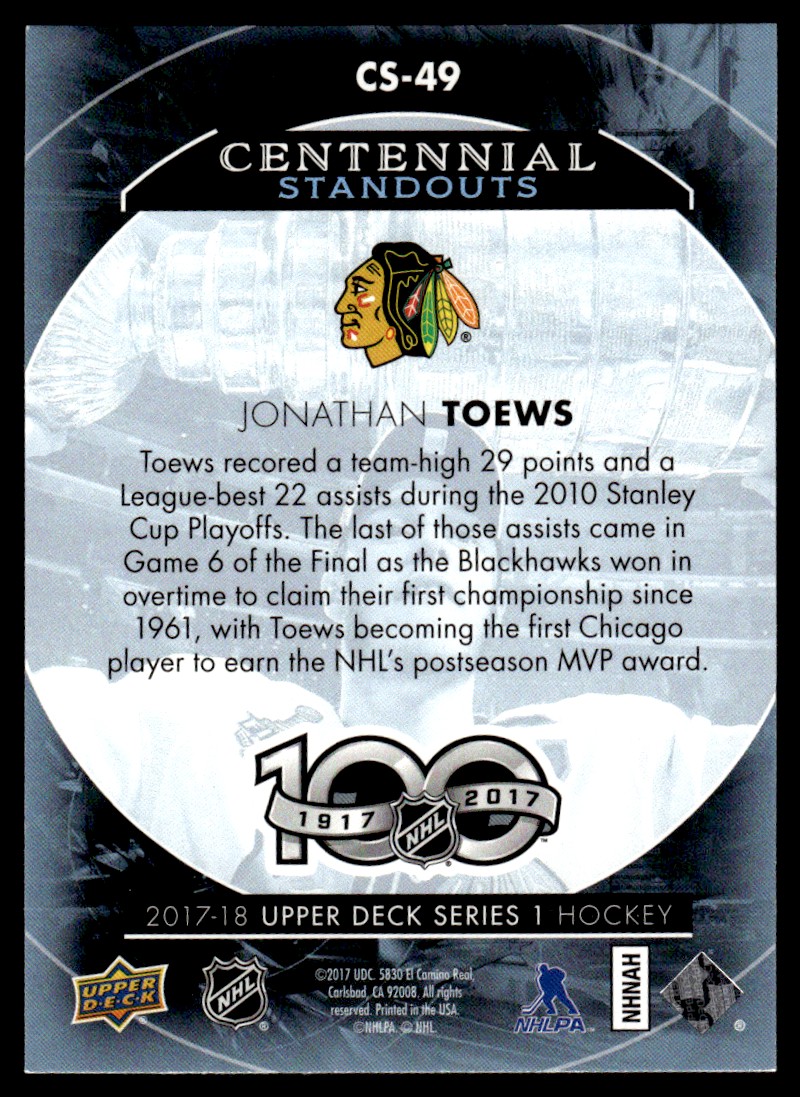 | Jonathan Toews #CS-49 2017-18 Upper Deck Centennial Standouts Chicago Blackhawks |