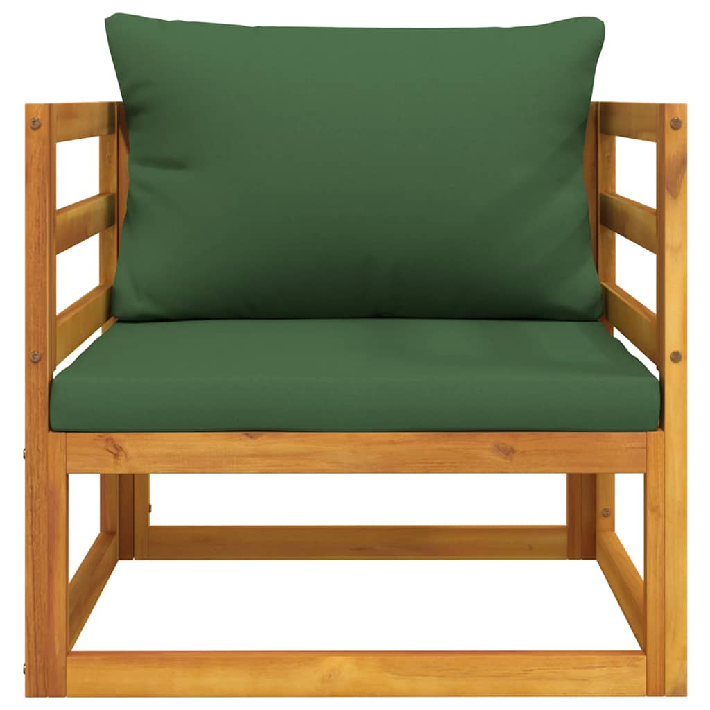 This Modular Garden Lounge Set combines style and functionality, great for chilling out on patios, balconies, or gardens. The elegant green and brown colors, sturdy solid acacia wood, and comfy removable cushions create an inviting spot for relaxation and outdoor entertainment.