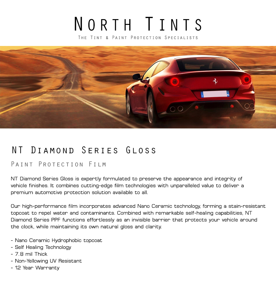Q: Will the film yellow prematurely? A: No, NT Diamond Series Gloss paint protection film has UV inhibitors that prevent yellowing.