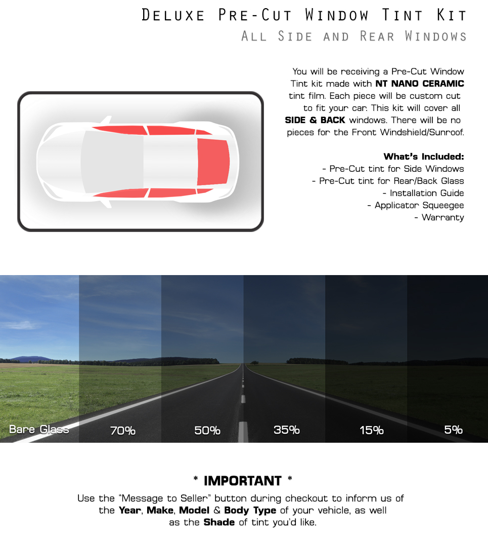 Q: What is the purpose of this product? A: This is a PreCut window tint kit made using NT Nano Ceramic window tint film. The product will be PreCut for your specific vehicle and will cover all side and rear windows.