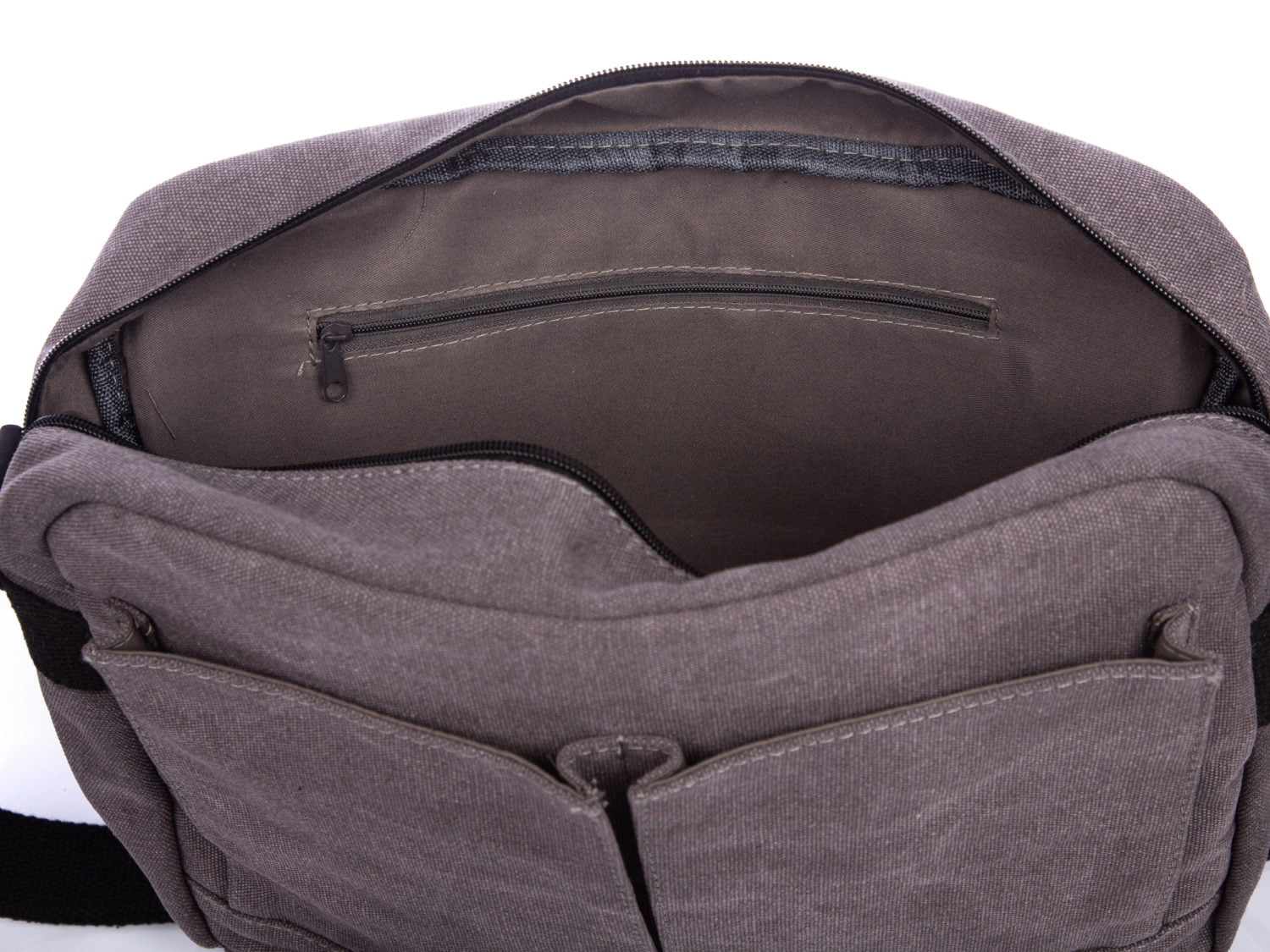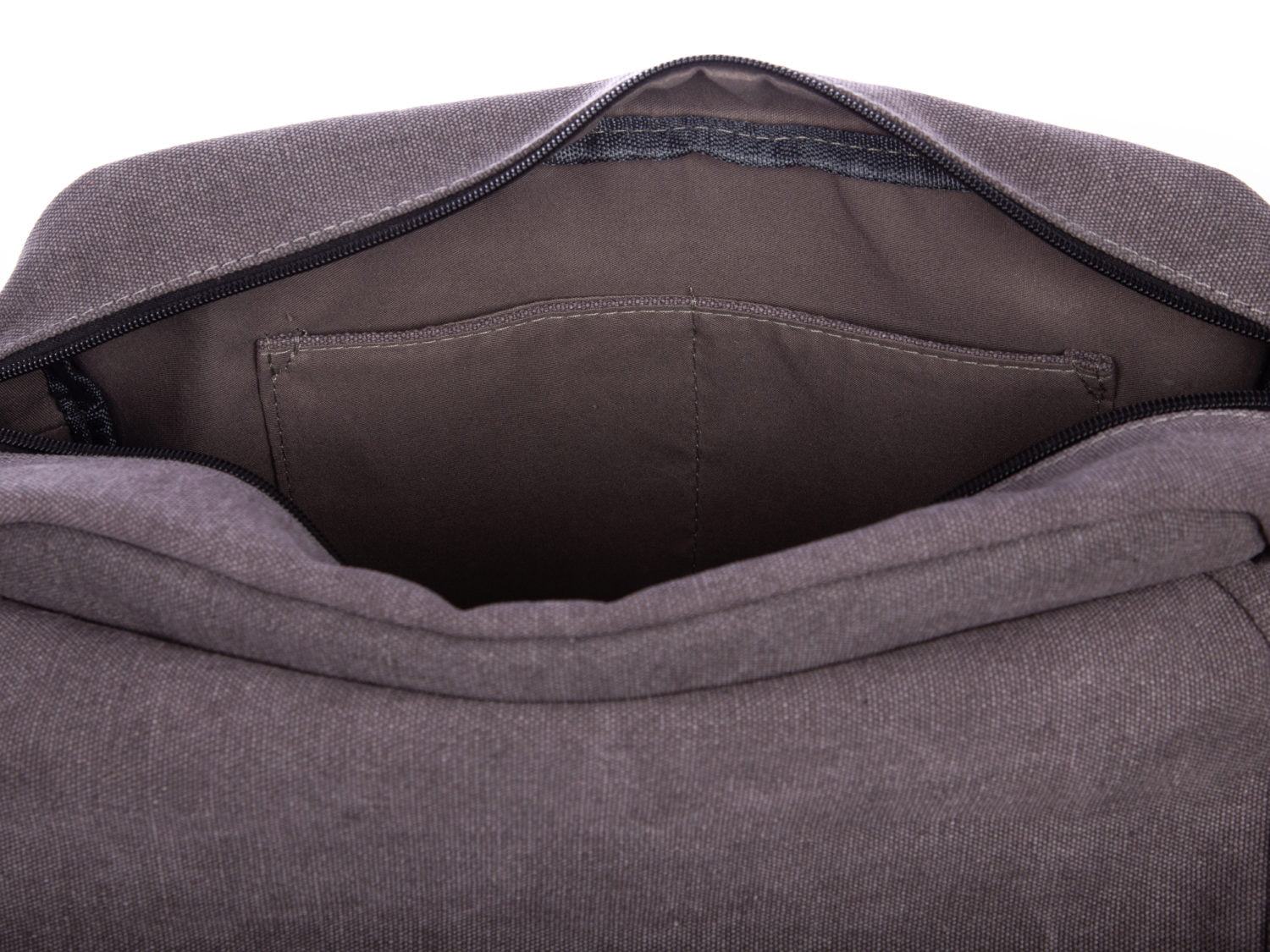 - Unter der Klappe: zwei vertikale Fächer mit Klettverschluss sowie ein großes Hauptfach mit Reißverschluss.