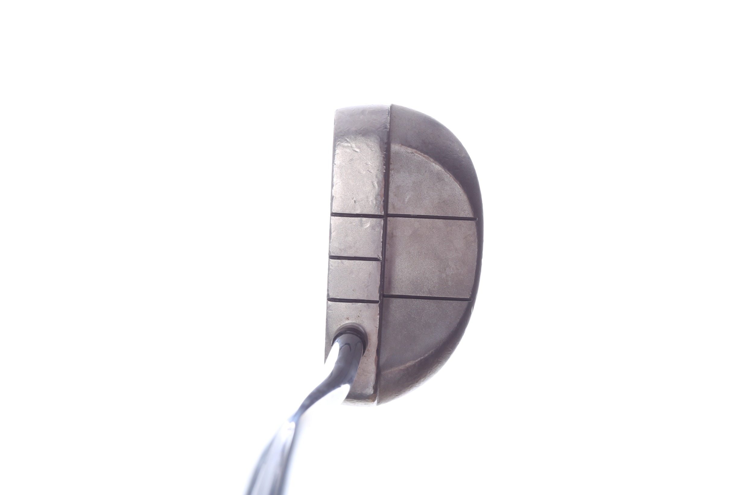 This putter is in average condition for its age. It has been well played by its former owner, and shows cosmetic wear including scratches, nicks, and paint chips on the face, sole, and crown.
