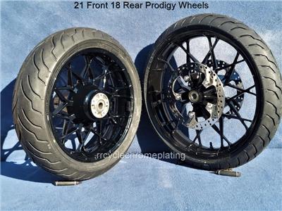 Harley Gloss Black Prodigy 21" Front & 18" Rear Wheels w/ Shinko 990 Tires and 2 Polish 12.6 Rotors