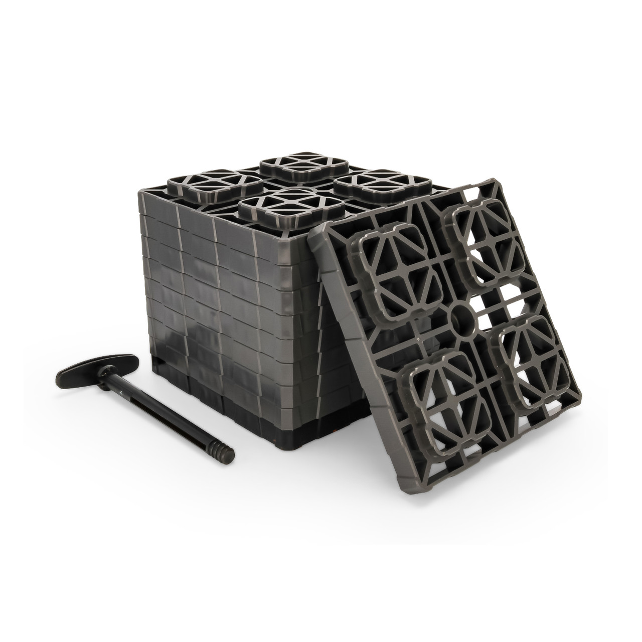 Upgrade your RV leveling experience with Camco's FasTen XL RV Leveling Blocks. This set of (10) gray, extra-large 2x2 blocks are 20% larger and 2x stronger than standard FasTen RV blocks. They provide a customizable leveling solution for your RV. Compatible with various wheels and axles, these durable blocks ensure smooth and reliable leveling. For best results, do not use with a stack height over 4 1/2". When not in use, the innovative T-handle design makes it easy to carry and transport the leveling blocks. Trust in FasTen's USA-made, XL leveling blocks for fast and safe camper leveling. Whether you're a seasoned RVer or just starting out, these blocks are the ideal choice.