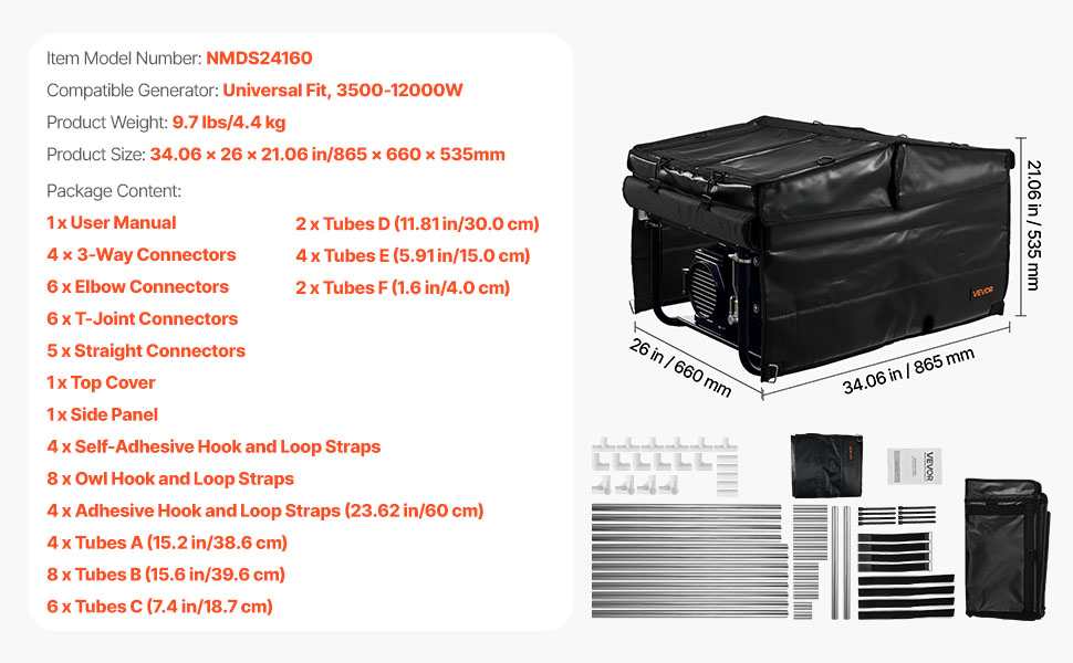 The frame features stainless steel tubes and PVC connectors for durability and impact resistance. Hook and loop straps secure the portable generator cover firmly in place, making installation and disassembly quick and easy while ensuring stability and convenience.