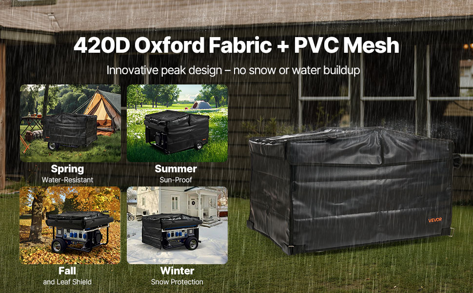 Waterproof Oxford Fabric: Made from durable 420D Oxford fabric with PVC mesh backing, this universal generator cover resists water, snow, dust, and aging. Tear-resistant and weather-tough, the pointed roof design avoids snow and water buildup