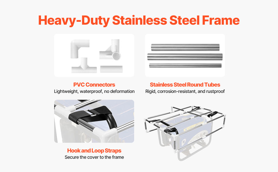 Reinforced Frame: Built with PVC connectors and stainless steel tubes, the generator cover frame is lightweight, waterproof, and corrosion-resistant. The tubes provide solid, stable support for your generator against external impacts