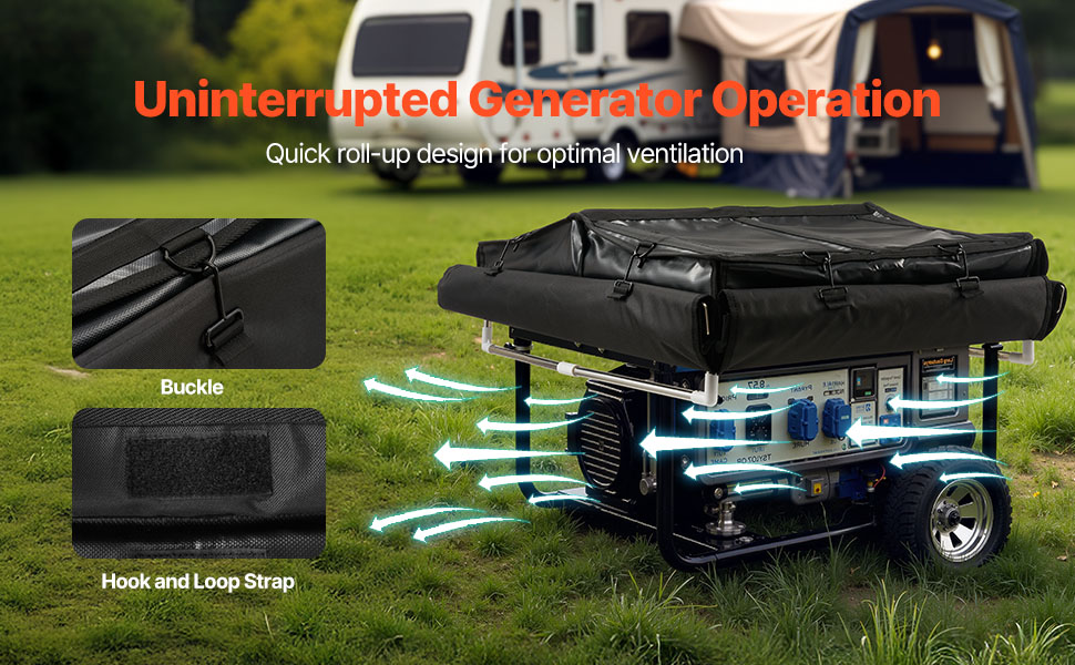 Ventilation-Friendly Structure: Side panels roll up easily and are secure with buckles and hook-and-loops, allowing for better airflow and cooling. The outdoor generator cover keeps your generator running efficiently and helps extend its lifespan