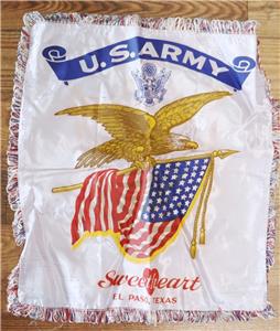 WW II US ARMY SWEETHEART EL PASO, TEXAS SATIN EAGLE SHAM PILLOW COVER EXCELLENT. The pillow sham is in mint condition, with no fading, no rips, no discoloration, and no damage of any kind. The shine is still prevalent. This has been kept in my collection room with no light to fade the sham. A beautiful U.S. Army pillow sham. A great addition to your military collection. The measurements are 17.5 x 16 inches without the fringe.
