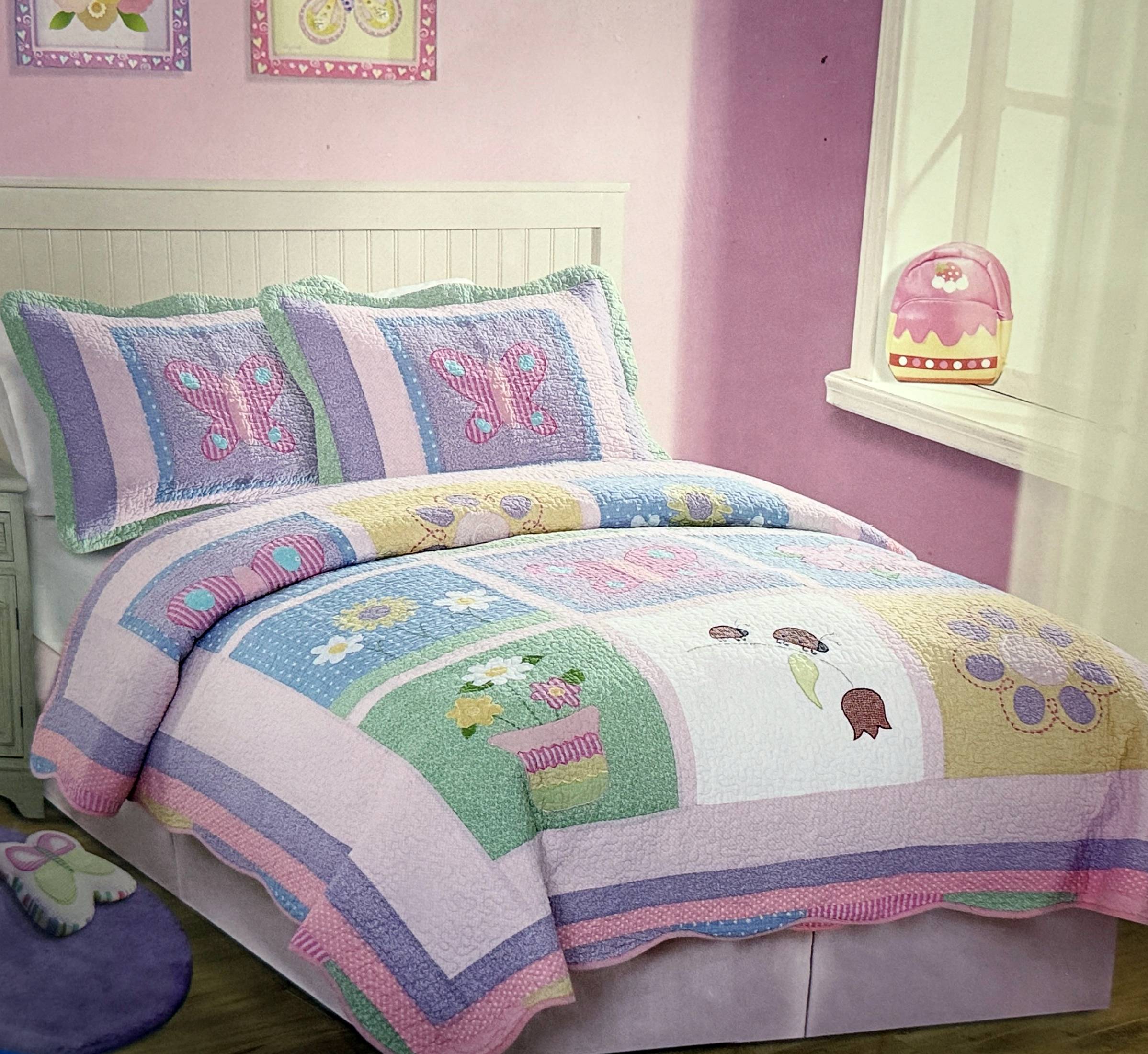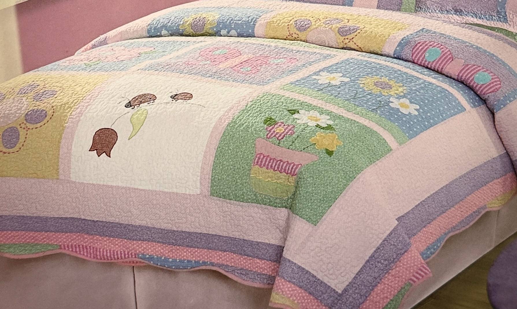 Sweet, colorful, and full of charm – this beautiful twin quilt set features a delightful patchwork design with butterflies, ladybugs, and floral appliqué details in soft pastel shades. Perfect for a girl’s bedroom, guest room, or a cheerful spring refresh.