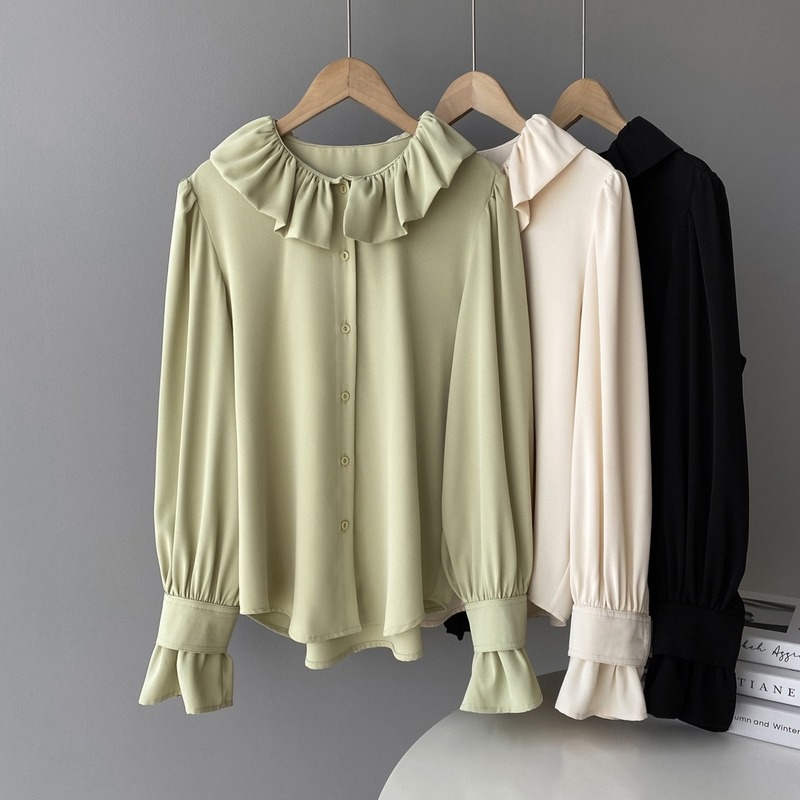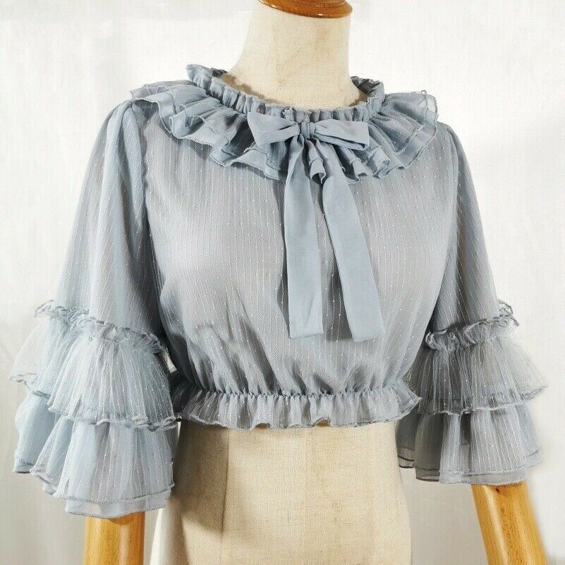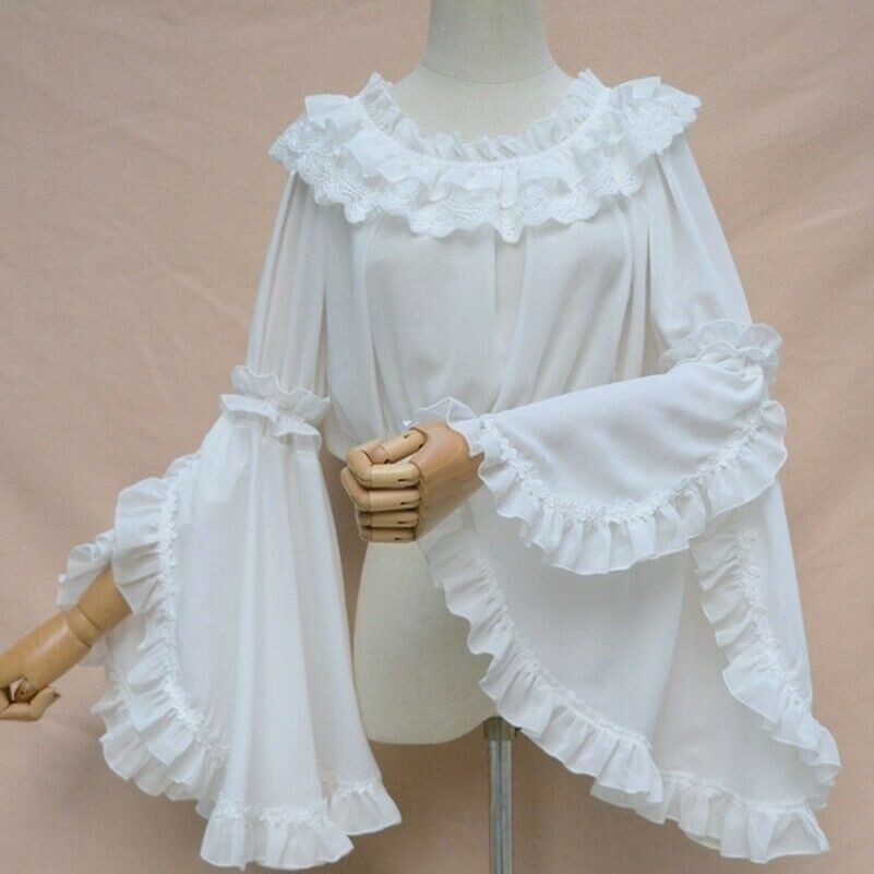 Chiffon Blouse Shirt Ruffle Collar Flared Sleeve Tops Preppy Retro Casual Basic