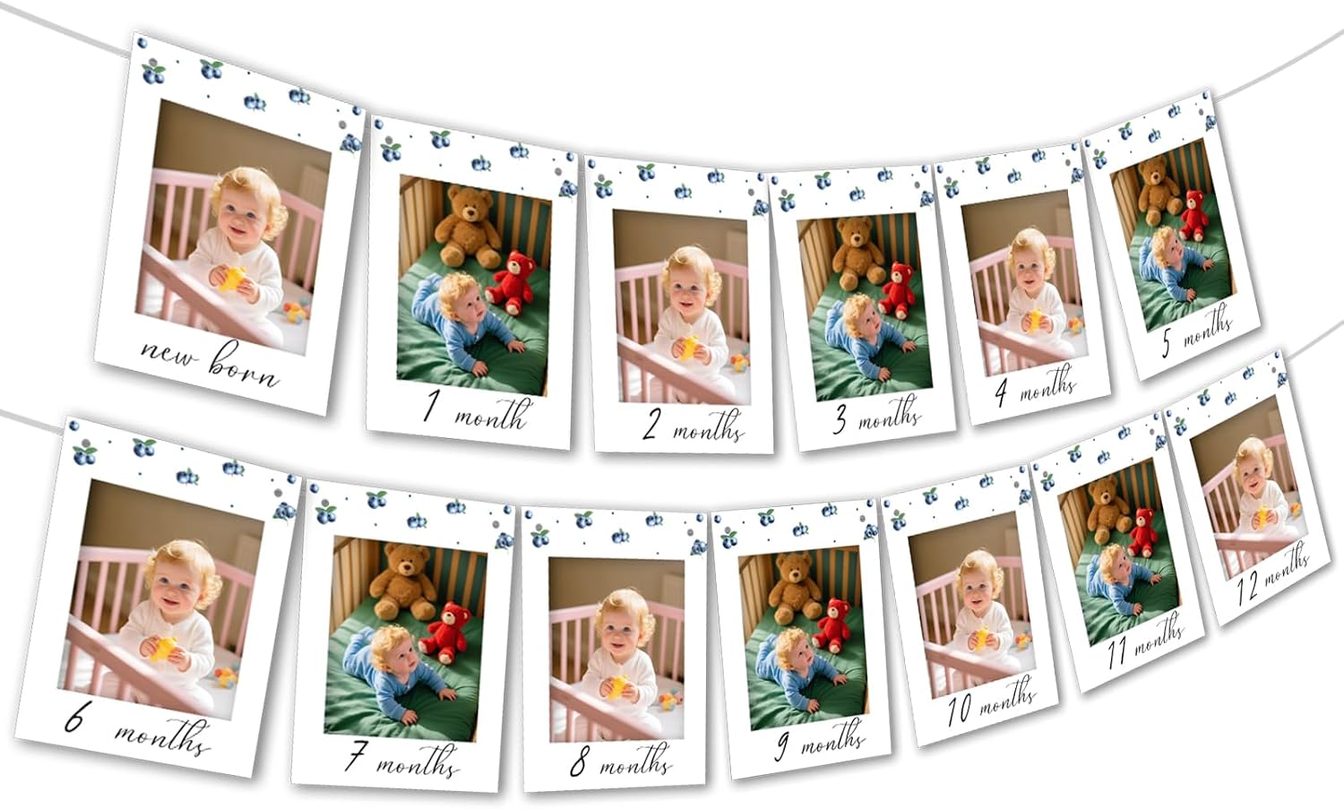 - Blueberry First Birthday Photo Banner: You will receive 1 “newborn” + 12 monthly blueberry photo banner (1 - 12 months). Adorned with sweet blueberry designs, it’s perfect for first birthday celebrations.