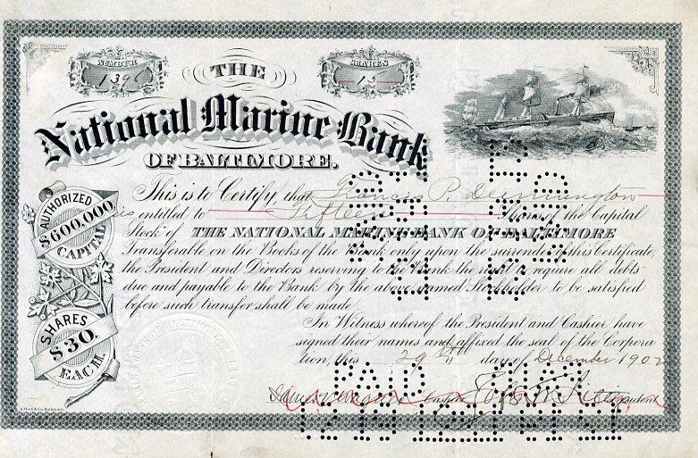 1902 National Marine Bank of Baltimore Stock Certificate. Early 20th century banking scripophily certificate from Baltimore Maryland with attractive vignette of late 19th century combined steam and sail powered ship. VF condition with punch cancellation.