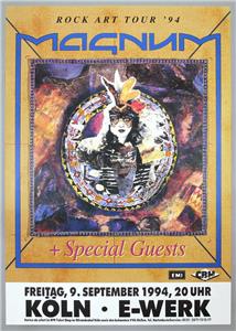 Scarce and highly collectible large original first printing concert poster advertising legendary Magnum at the E-Werk in Cologne [Germany] on Friday, 9th September, 1994, in support of the Rock Art album, the band's tenth album, produced by Tony Clarkin and released in July 1994.