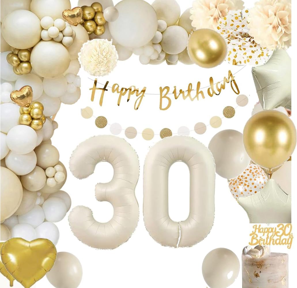🎂【30th birthday women men】Contains 1 set "HAPPY BIRTHDAY" banner, including 10*12inch gold balloon, 10*5inch gold balloon, 10*12inch white balloon, 5*5inch white balloon, 15*12inch beige balloon ,8 * 5 inch beige balloon, 5 x golden dot balloons, 1 * 18 inch 1 star balloon and 1 * heart balloon, 2 x mini heart balloons, 1 * 30 number balloons in cream, 1 x cake decoration, 1 x adhesive tape, 1 x Roll ribbon.1 x balloon strip, 2 x beige paper flowers, 1 x Bohemian paper dot garland