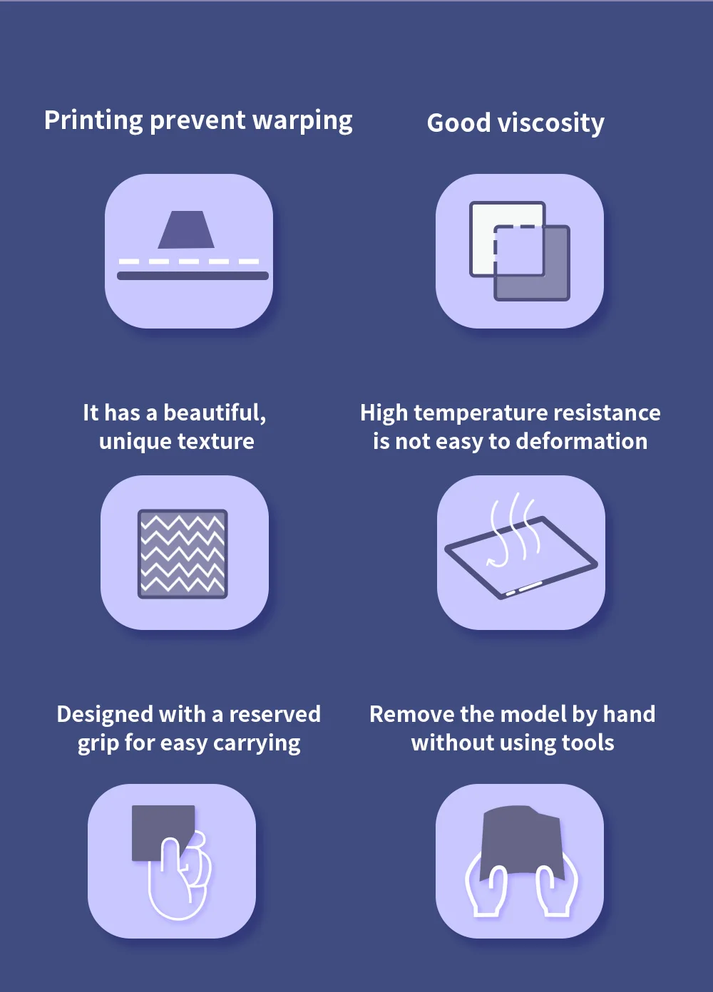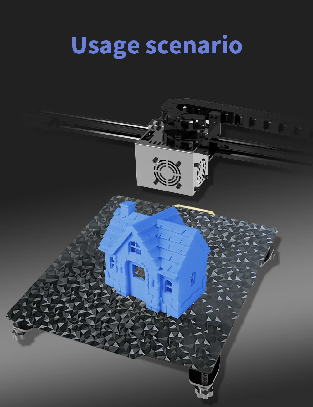 4. we suggested printing temperature: PLA 60℃ PETG 70-80℃ ABS 90-100℃.