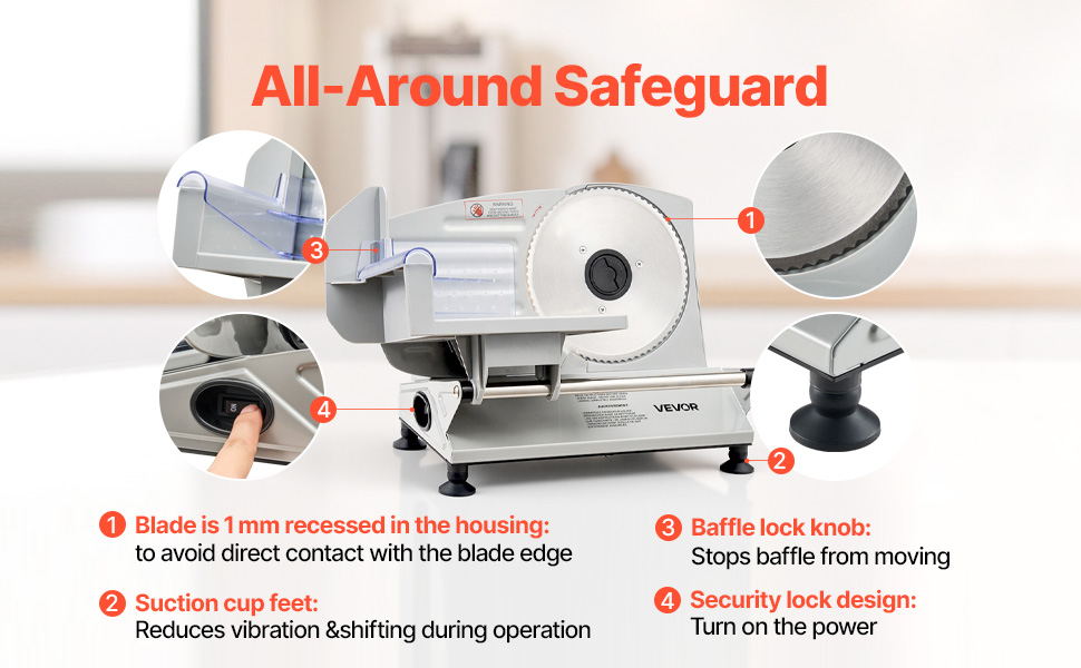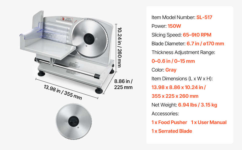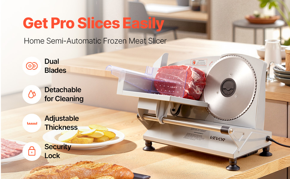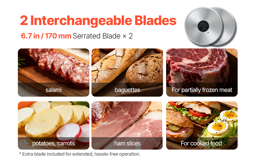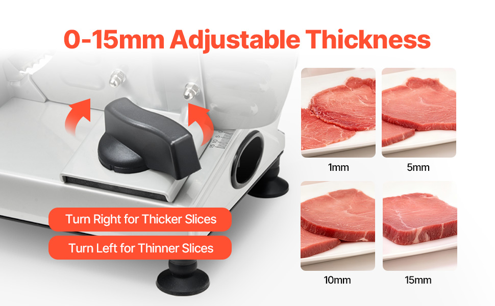 With the 0-15mm(0.6 in) adjustable knob, you can easily switch between ultra-thin and thick slices, ensuring uniform cuts without slanting, making it ideal for slicing frozen meats, deli meats, fruits, vegetables, baguettes, and more with the deli slicer.