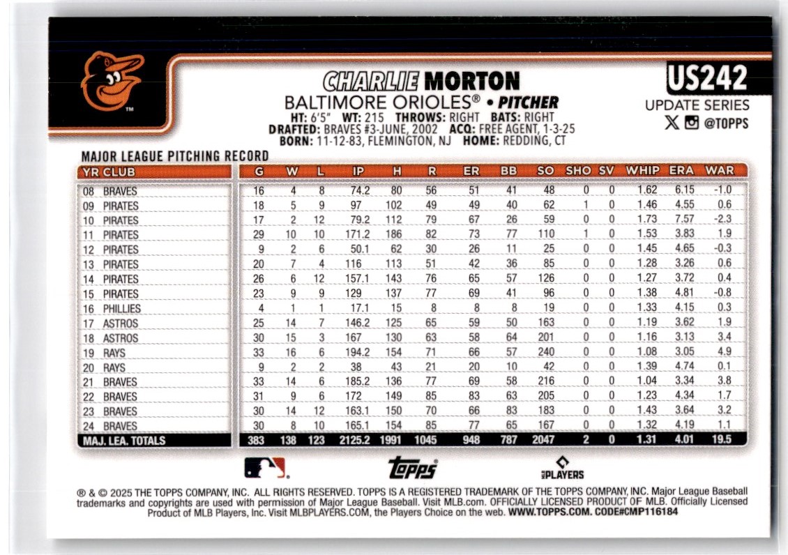 | 2025 Topps Update Rainbow Foil Charlie Morton RC Baltimore Orioles #US242 |