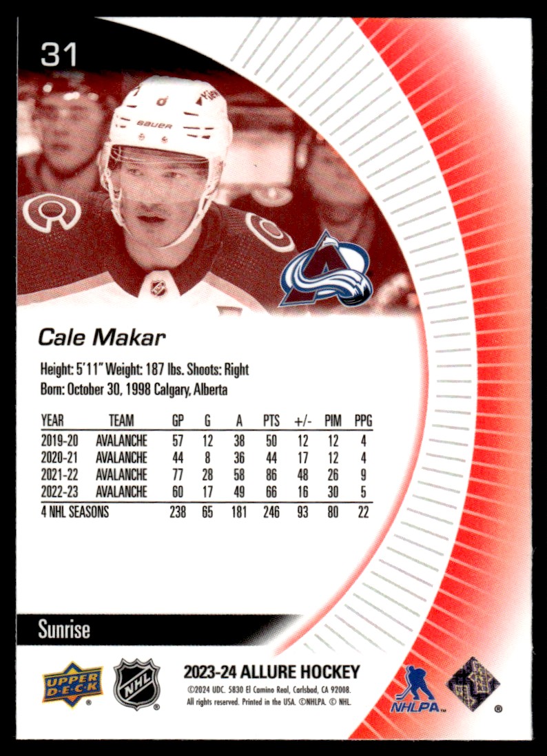 | Cale Makar Sunrise #31 2023-24 Upper Deck Allure Colorado Avalanche |