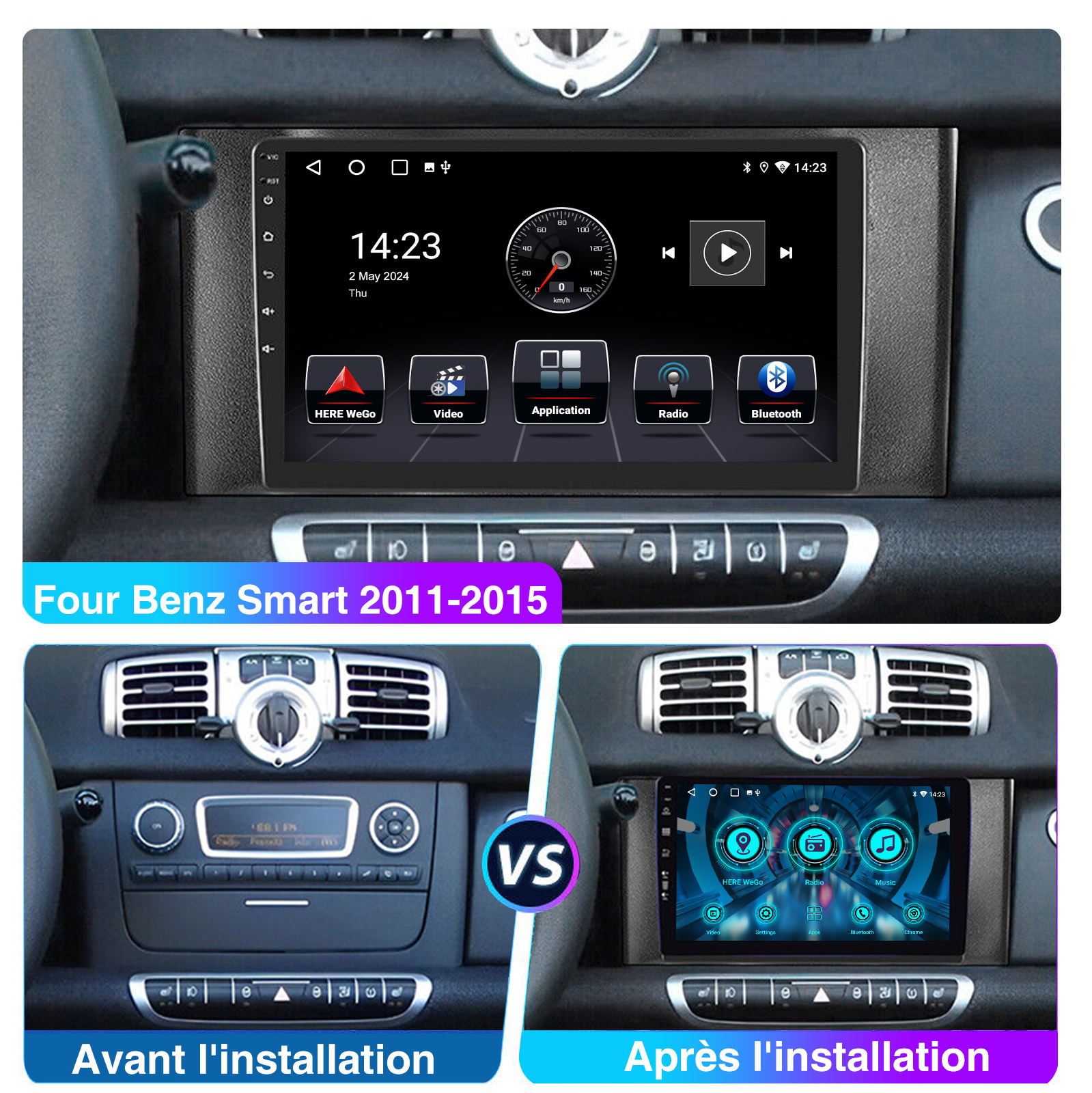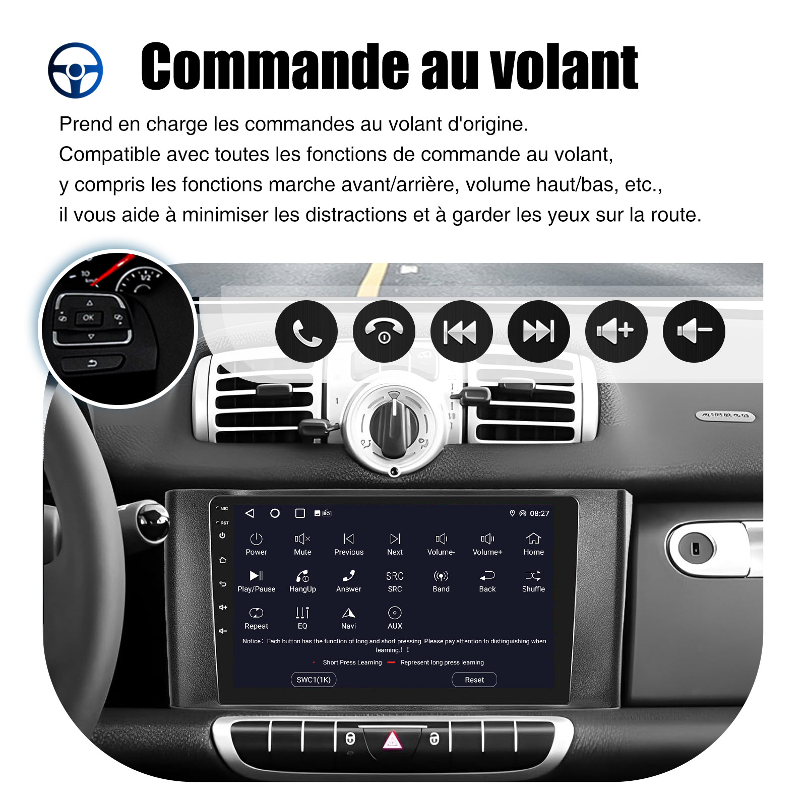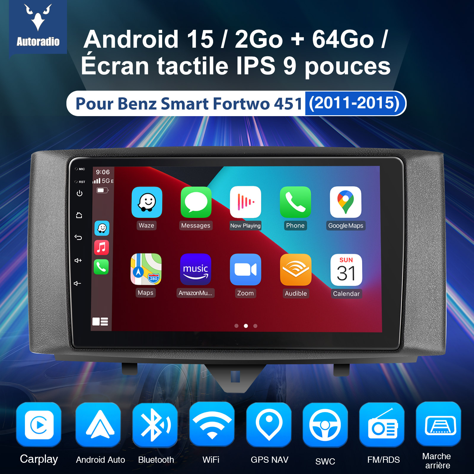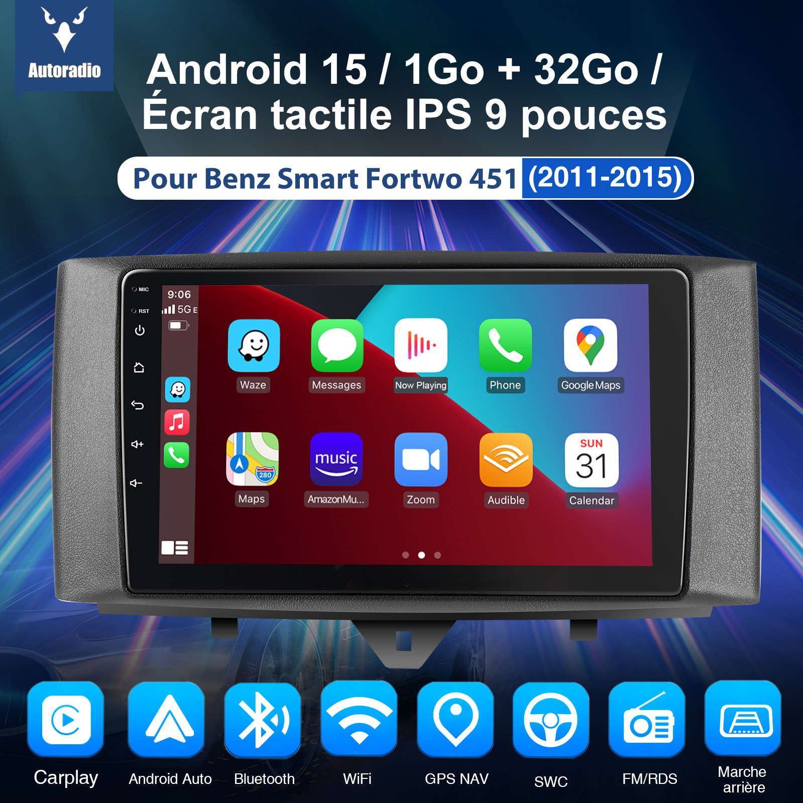 Autoradio Android 15 9 pouces pour Smart Fortwo 451: Cet autoradio Bluetooth est adapté pour VW/PASSAT/GOLF/SEAT/SKODA/POLO. L'autoradio Android avec écran tactile capacitif 9", 1Go/2Go/4Go de RAM et 32Go/64Go de ROM vous permet de télécharger vos applications et vidéos préférées pour que la conduite ne soit plus ennuyeuse. (Choisissez pour vous-même).Aucun châssis supplémentaire, aucun câble à modifier, installation simple et rapide. Compatible avec le bus CAN, il prend en charge la plupart des fonctions d'origine : commandes au volant, feux de recul, lecture des données de l'ordinateur de bord, etc.Ajoutez un microphone avec l'entrée microphone arrière pour rendre votre voix plus claire (microphone non inclus).