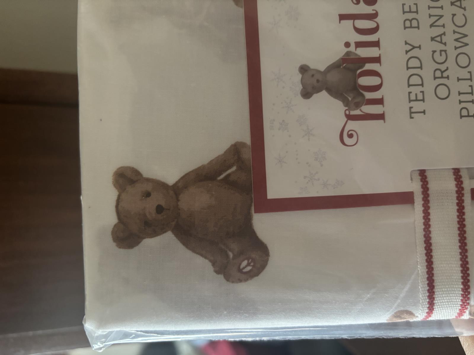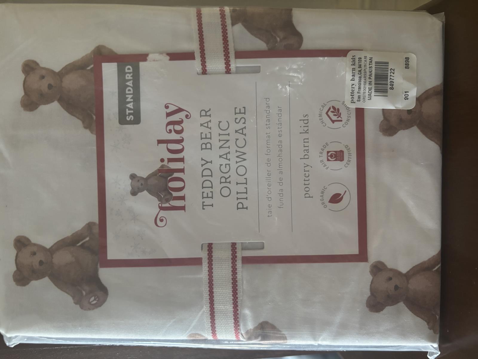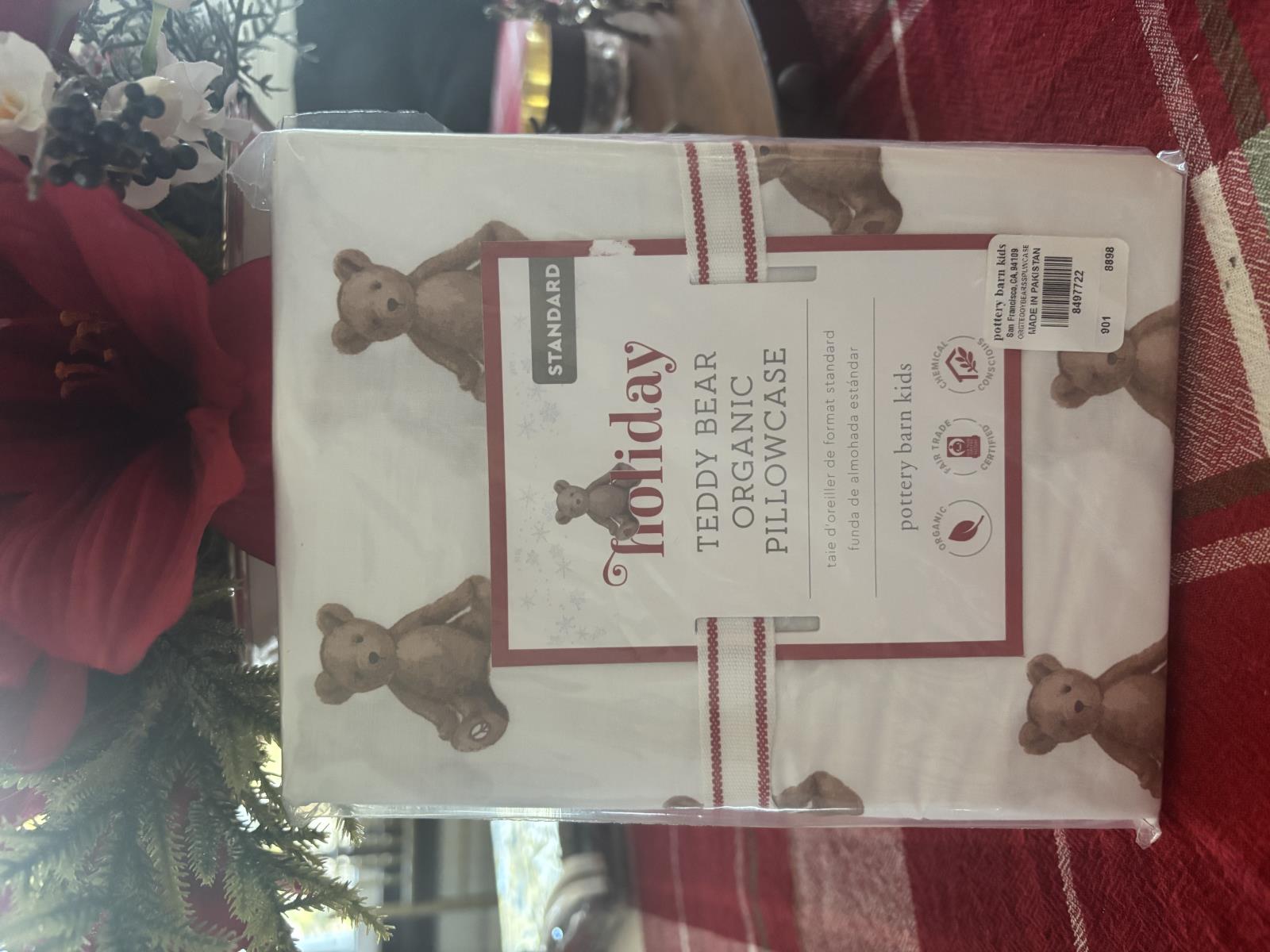 New Pottery Barn Teddy bear holiday edition cotton -standard pillowcase new in the package. White background with cute teddy bears scattered all over in rows.