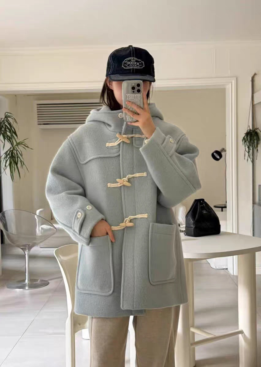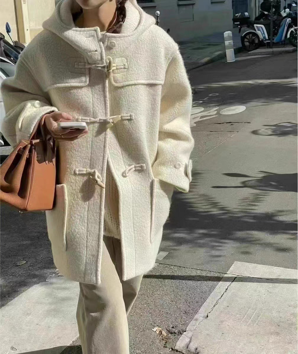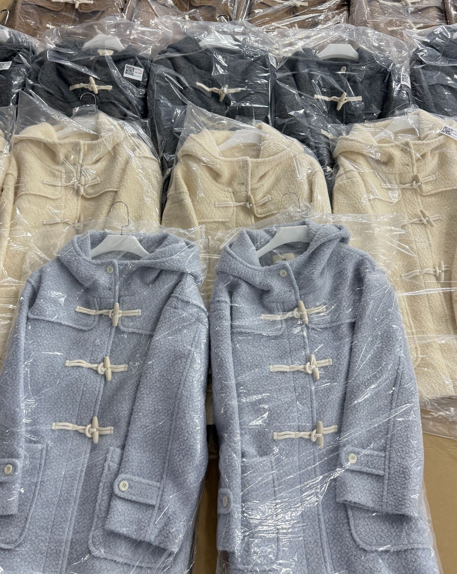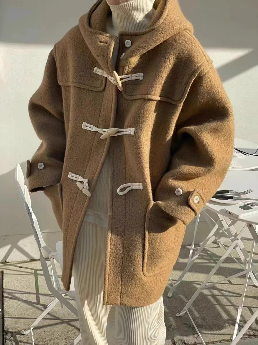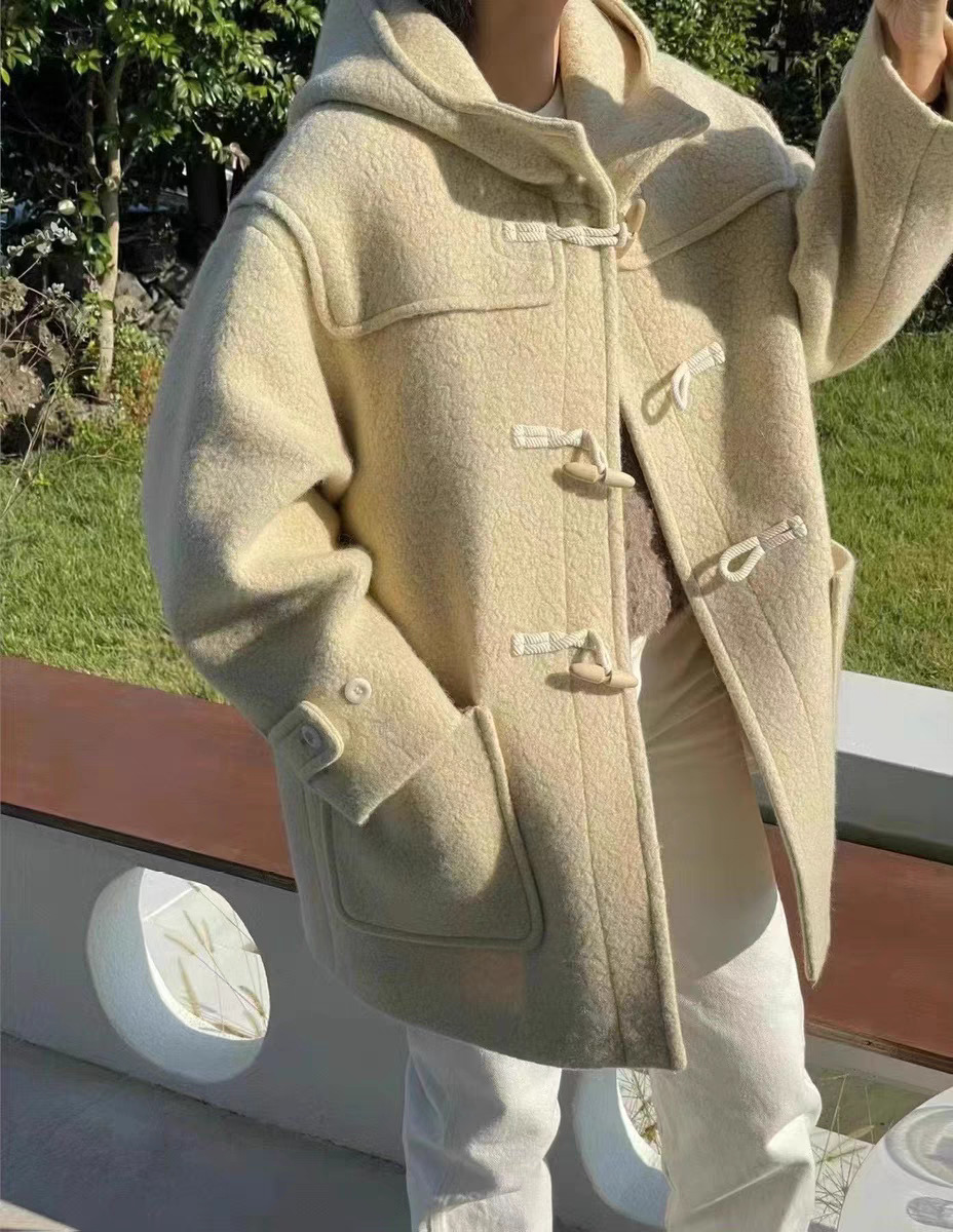 2026 New Korean Solid Color Hooded Horn Button Coat Women's Wool Trench Jackets