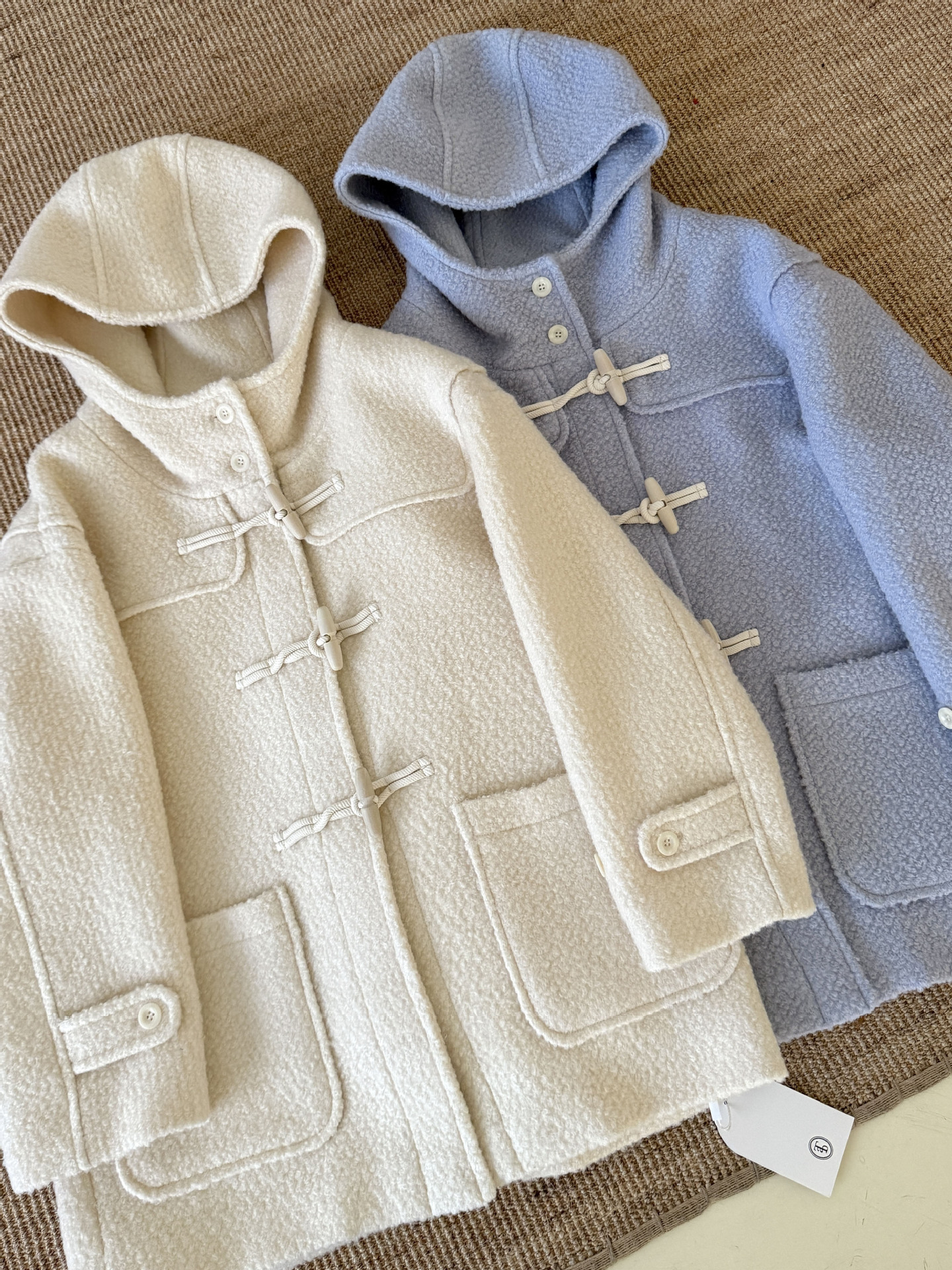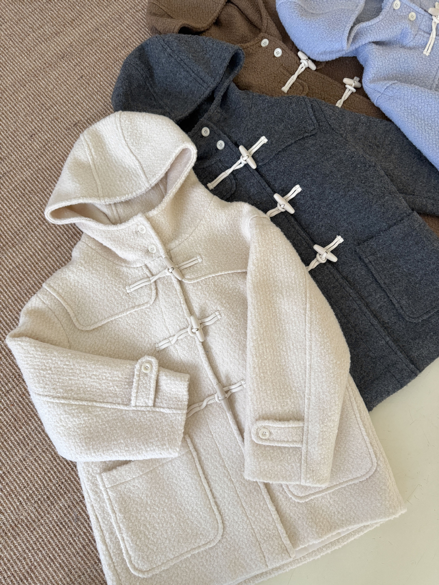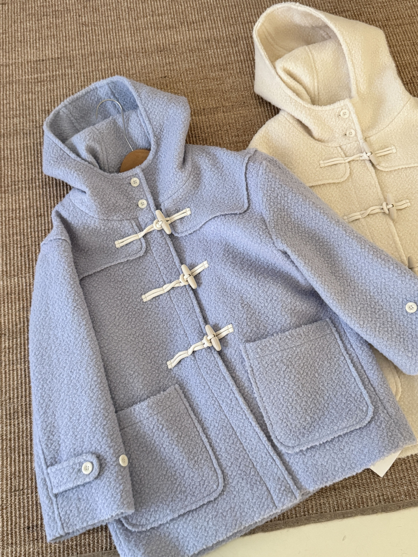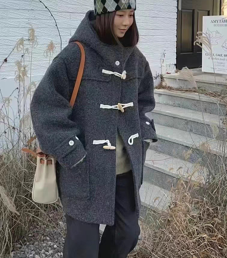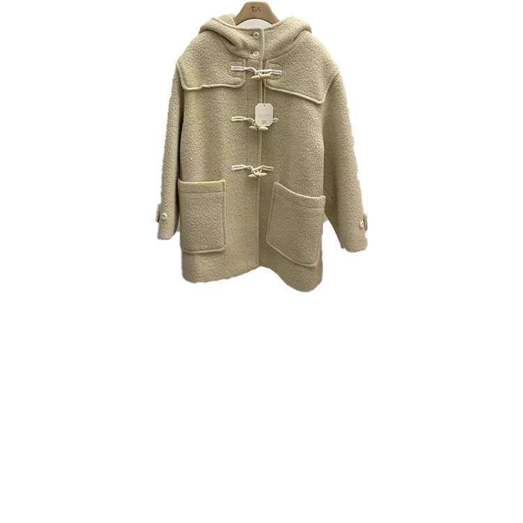 2026 New Korean Solid Color Hooded Horn Button Coat Women's Wool Trench Jackets