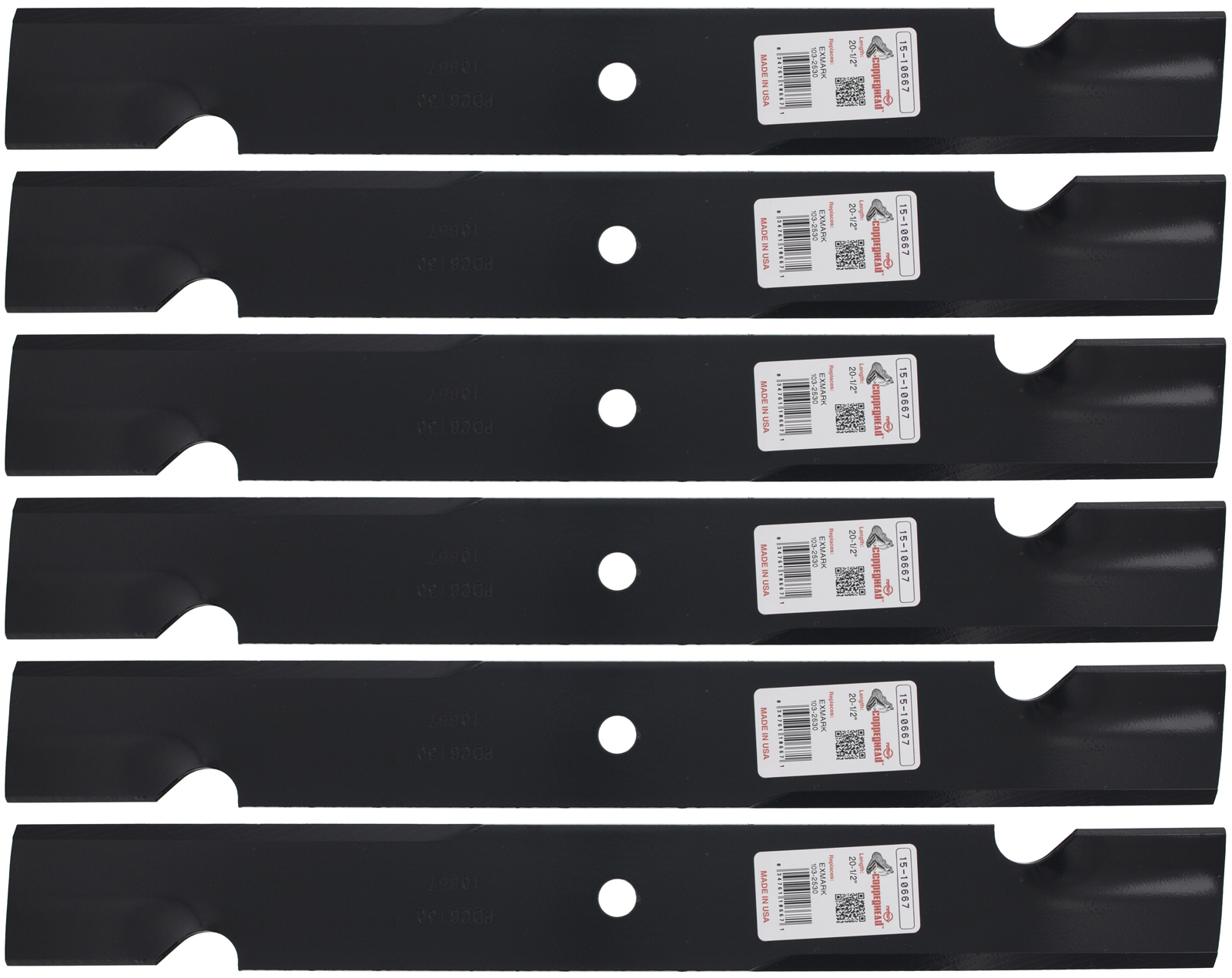 Six (6) pack of Rotary® 10667 replacement lawn mower blades for Ariens, Bad Boy, Bunton, Dixie Chopper, Exmark, Gravely, Hustler, Toro, and Winsdor mowers. Requires three (3) blades for 60-inch decks. Fits OEMs: 08899100, 08979600, 09081200, 038-2007-00, 038-6002-00, 038-6050-00, 038-6060-00, PL7441, 30227-60, 30227-60H, 30227-60V, A60227-60N, 1-613112, 1-613250, 1-633483, 103-0301, 103-0301-S, 103-1580-S, 103-2530, 103-2530-B, 103-2530-M, 103-2530-S, 613112, 613250, 633483, 025124, 046999, 08781800, 08781851, 08899100, 089046, 08904651, 08979600, 090812, 09081200, 46999, 48864, 89796, 8979651, 603992, 105-7718, 105-7718-03, 1057718, 108-1114, 108-1123, 50-2814.