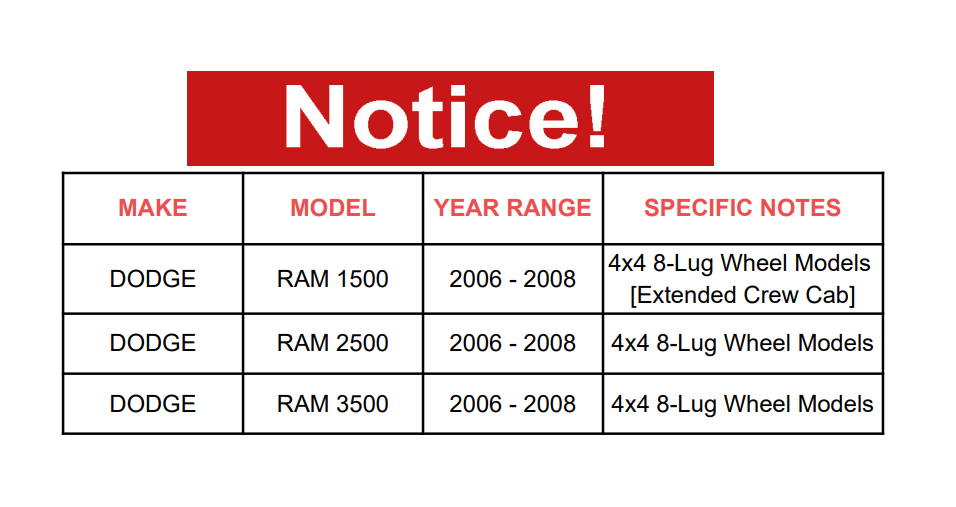 | DODGE | RAM 2500 | 2006 - 2008 | 4x4 8-Lug Wheel Models |