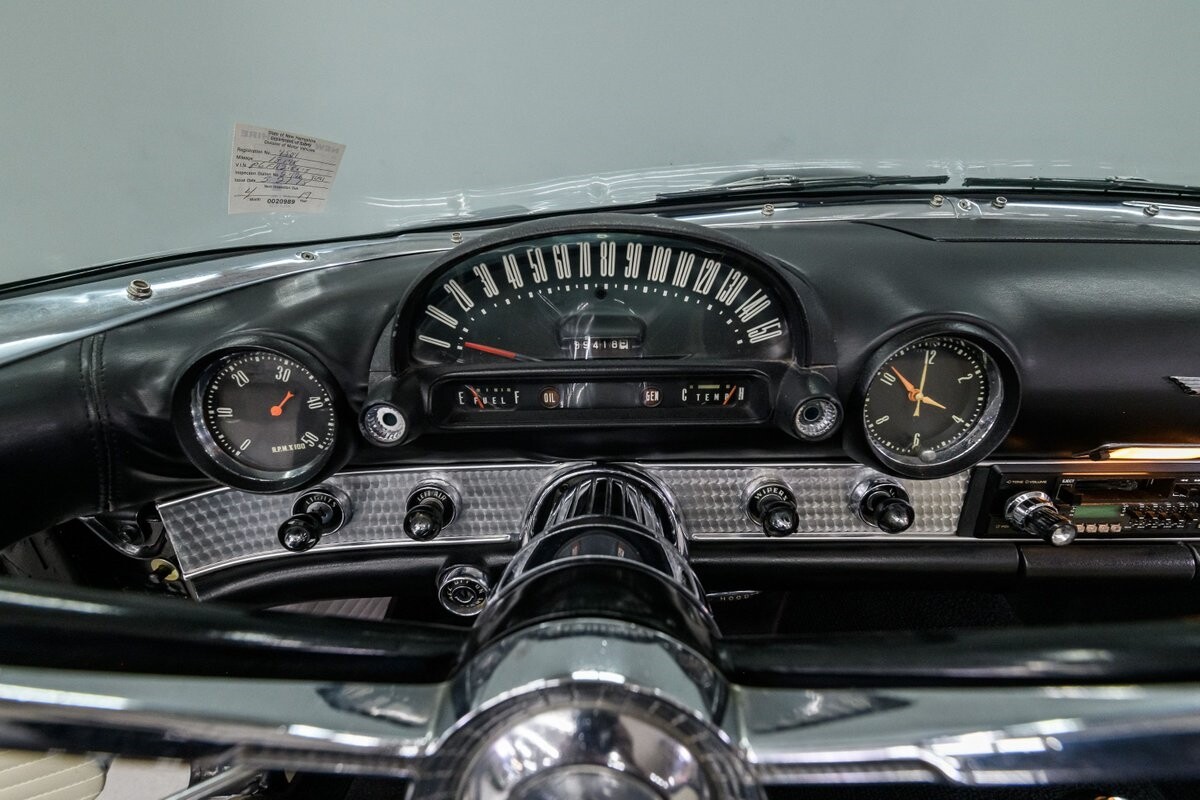 The T-Bird interior was re-upholstered in black and white vinyl (1992) and the carpeting was replaced. An 'Astra-Dial Control Panel" dash houses gauges, tachometer and clock. An aftermarket AM/FM/Cassette sound system has been installed, but the original 'Town and Country' radio has also been upgraded with new electronic components and is included. The Thunderbird is equipped with power windows and Ford designed a telescoping steering wheel for ease of entry and exit.