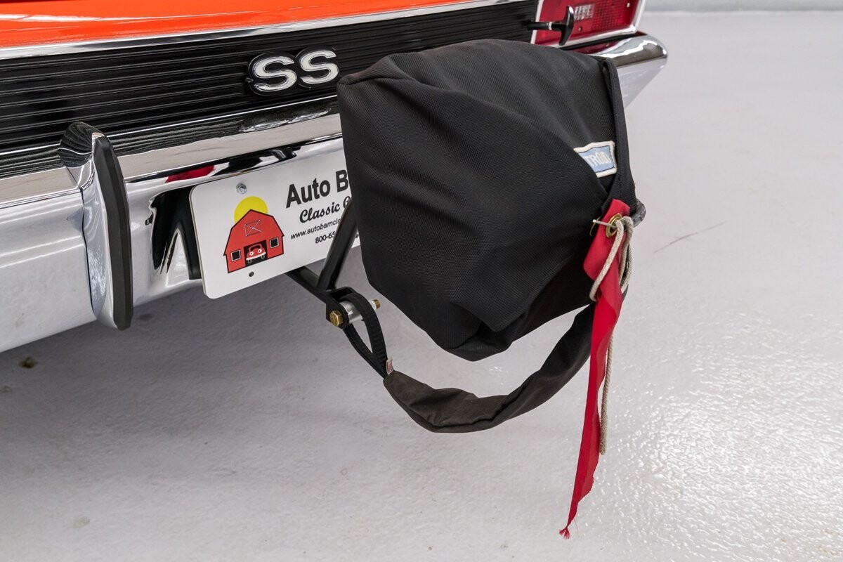 The handsome orange vinyl interior incorporates a full chromoly roll cage with breakaway bar designed by HR Racecars. The upholstery is the factory Nova deluxe interior design but specially created with Hugger Orange vinyl by PUI interiors. Front seats are Ultra Shield aluminum racing seats with perfectly fitted custom orange seat covers. Other features include a C3 Corvette tilt wheel, Covan dash with Pro Comp Autometer gauges, all new hardware and Race Quip harnesses/window net. The details of this one-off Hugger Orange interior is amazing.
