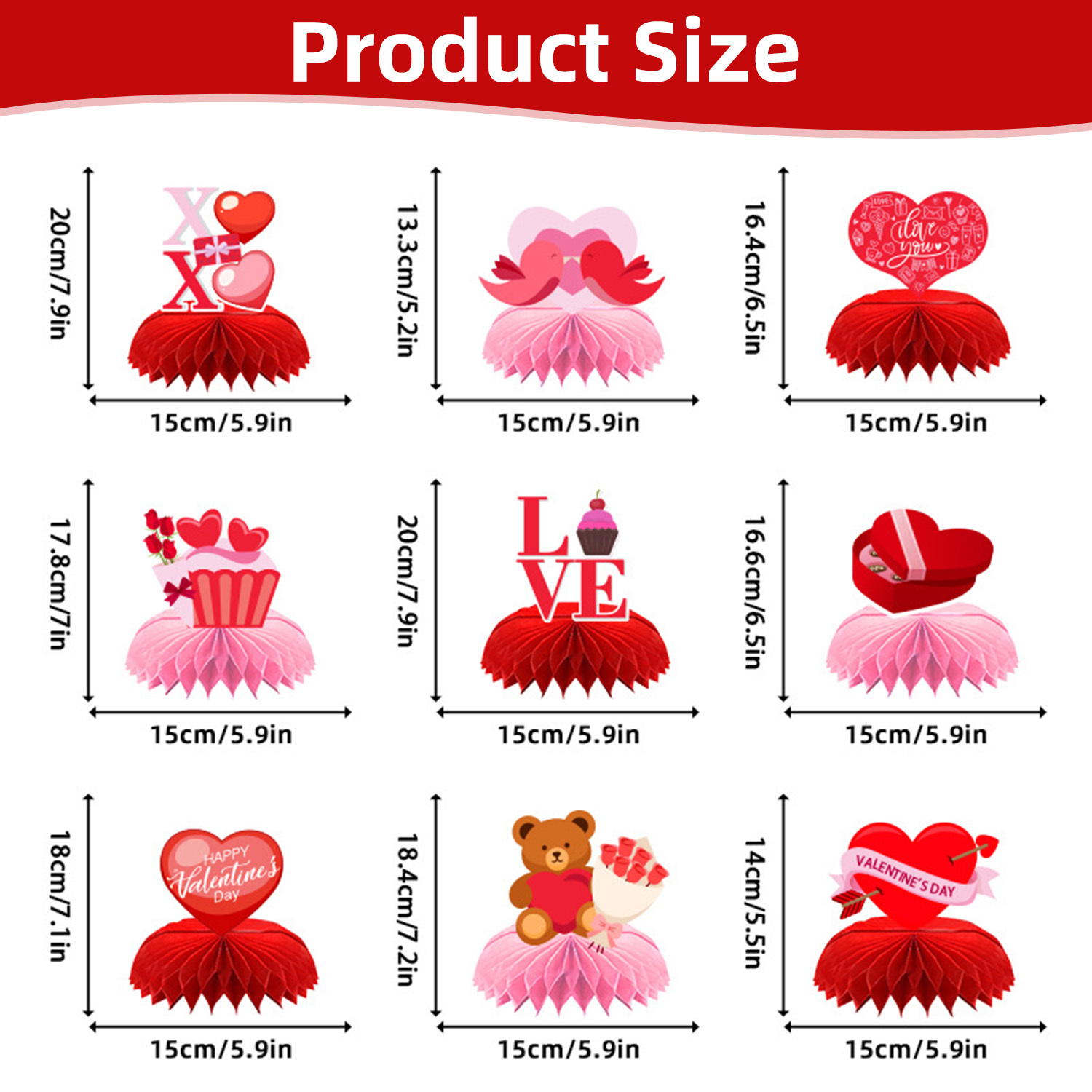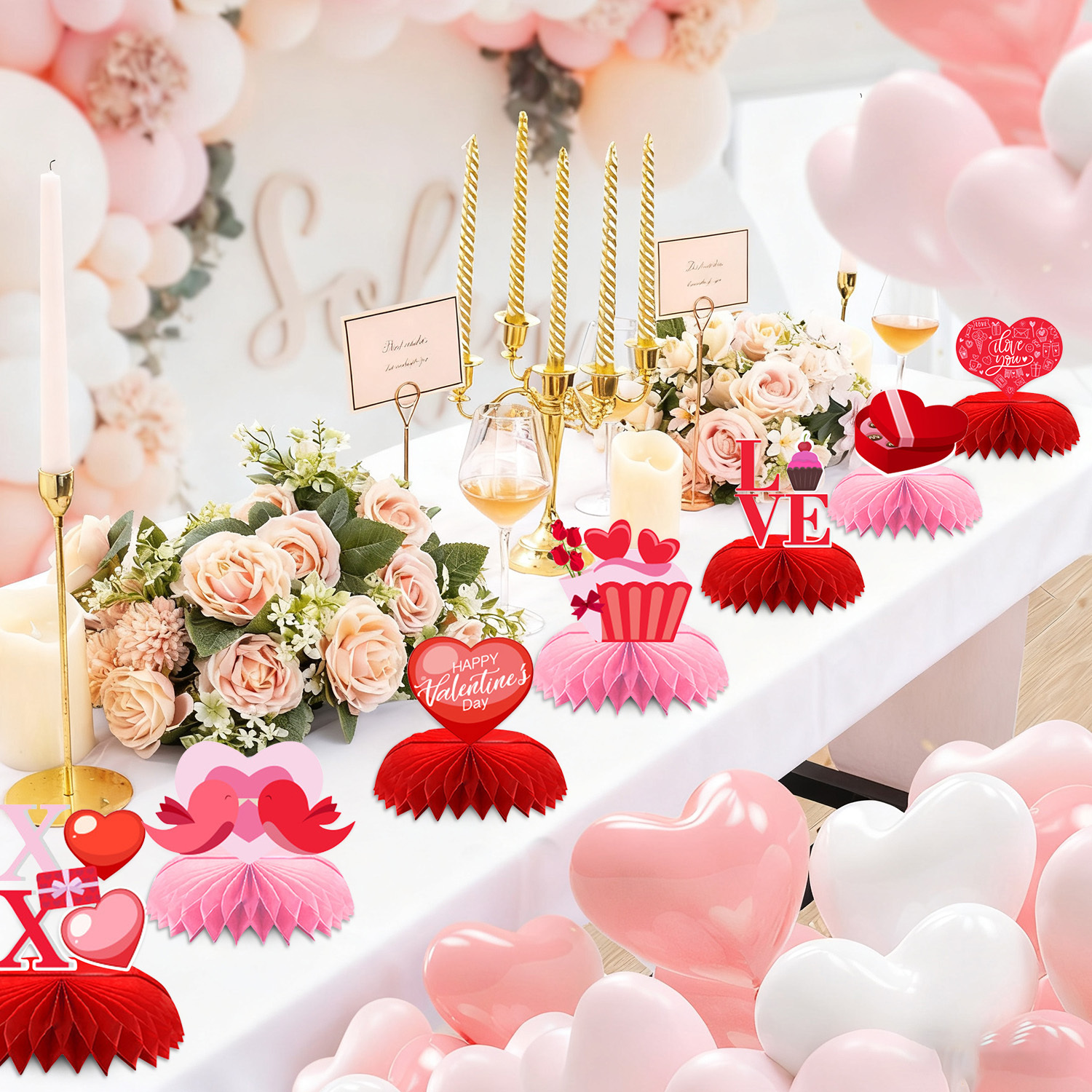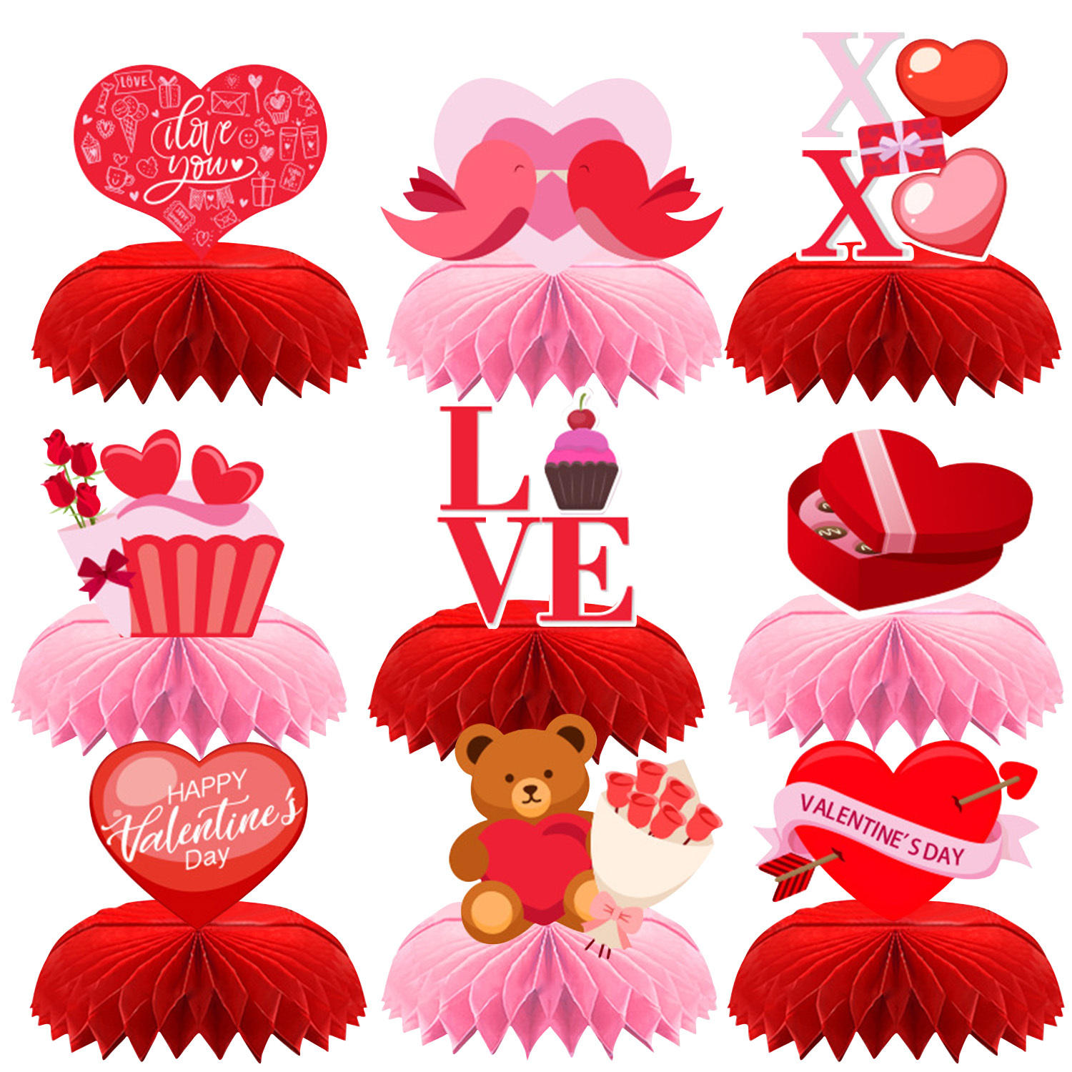 Love and Heartwarming Designs - This set includes nine unique centerpieces adorned with hearts, loving messages, and kiss motifs. The vibrant shades of red and pink evoke feelings of warmth and affection, perfect for setting a festive mood.
