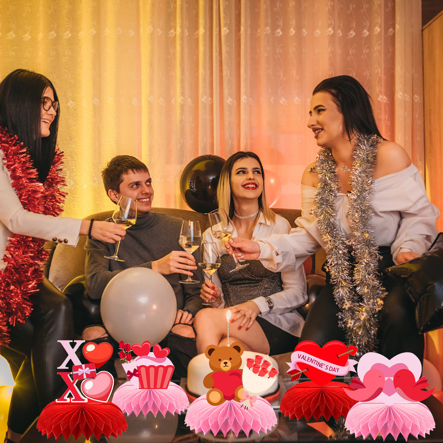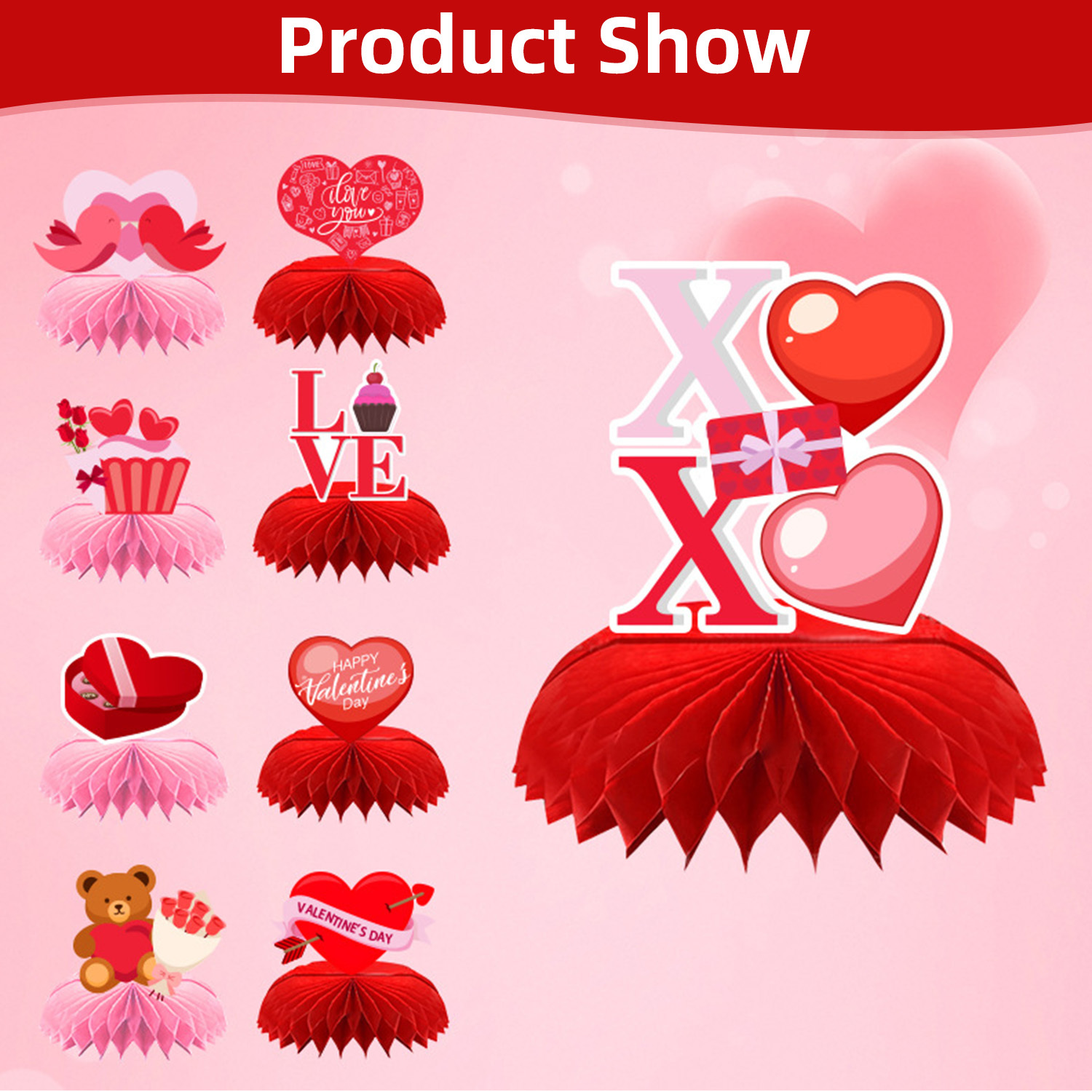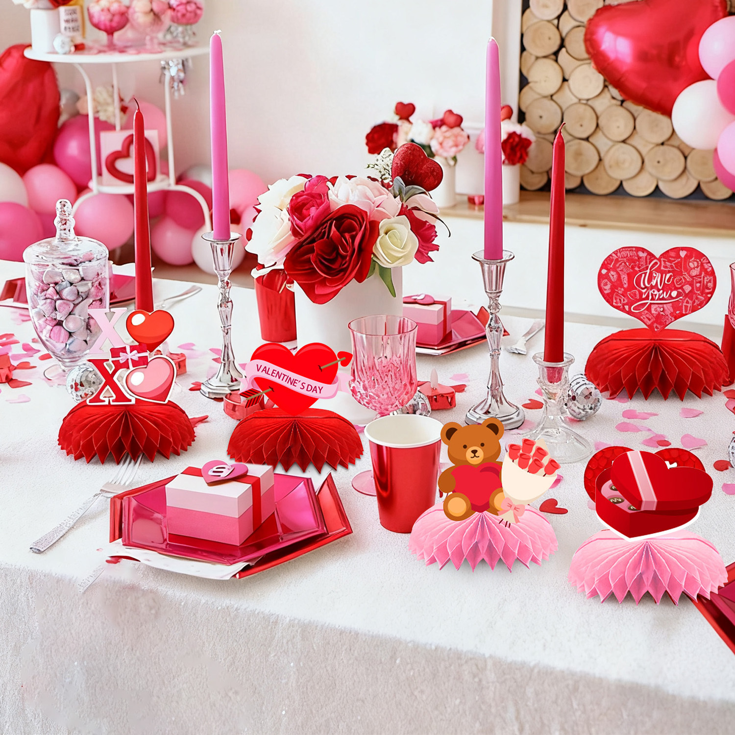 Love and Heartwarming Designs - This set includes nine unique centerpieces adorned with hearts, loving messages, and kiss motifs. The vibrant shades of red and pink evoke feelings of warmth and affection, perfect for setting a festive mood.
