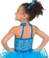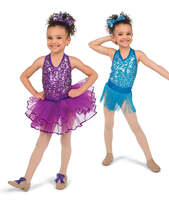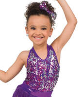 Lined paillette sequin mesh and solid spandex leotard with foil lycra trim. Made in the USA.