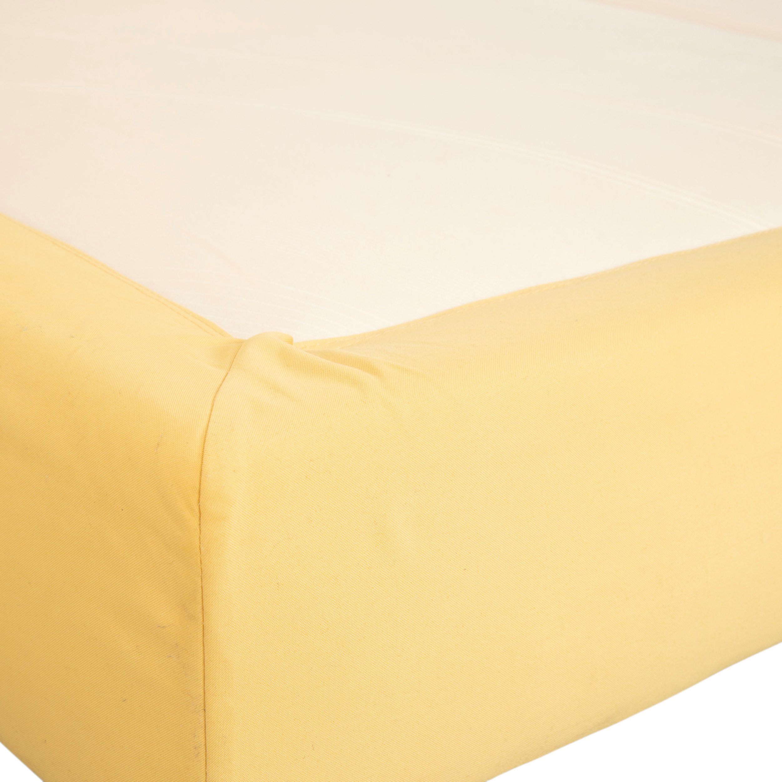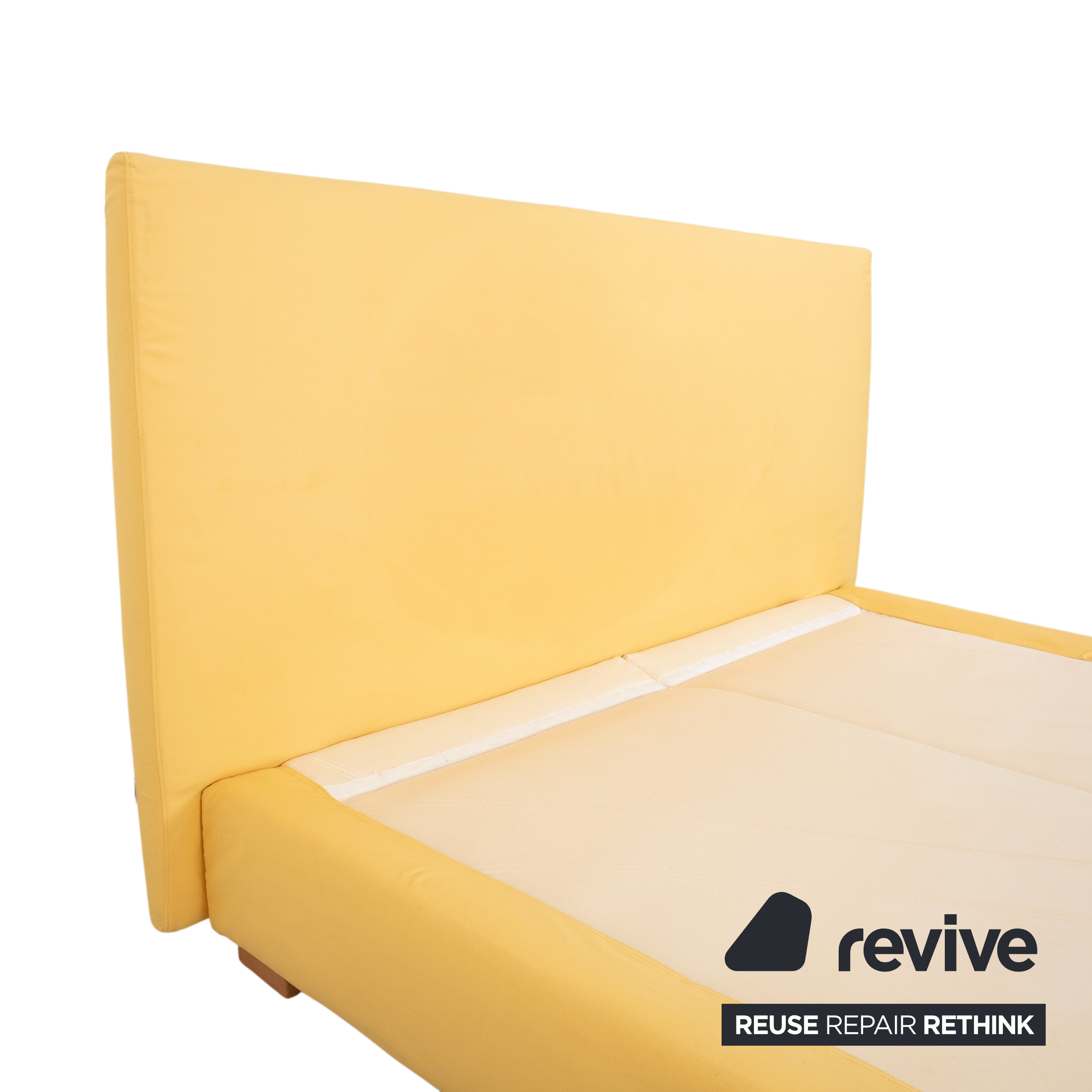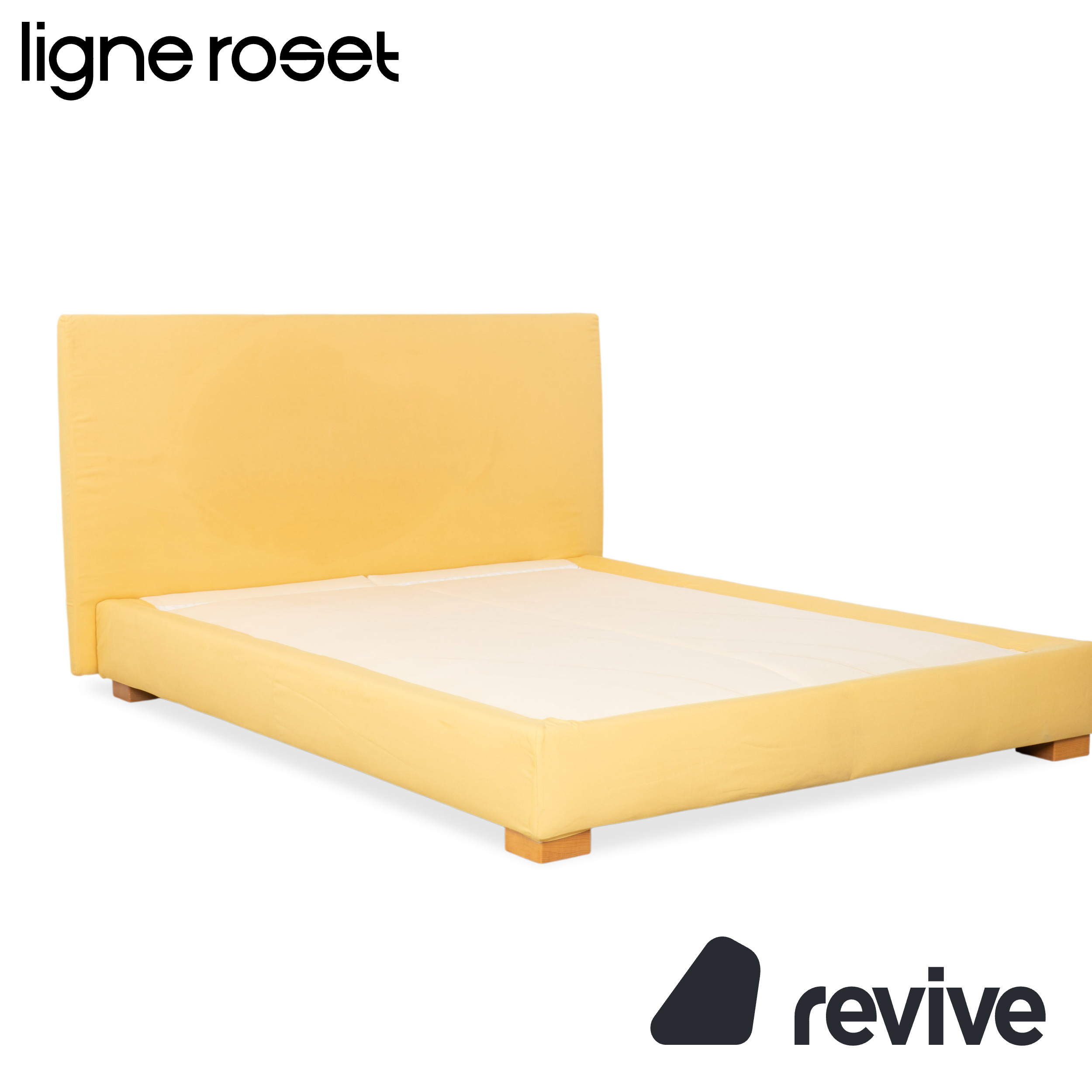 Auch der Bettrahmen ist vollständig mit dem gelben Stoff bezogen, was dem Möbelstück eine weiche, textile Anmutung verleiht. Getragen wird die Konstruktion von soliden, quadratischen Holzfüßen in einem natürlichen, hellen Holzton. Diese Blockfüße sorgen für Stabilität und unterstreichen den natürlichen, bodenständigen Charakter des Designs.