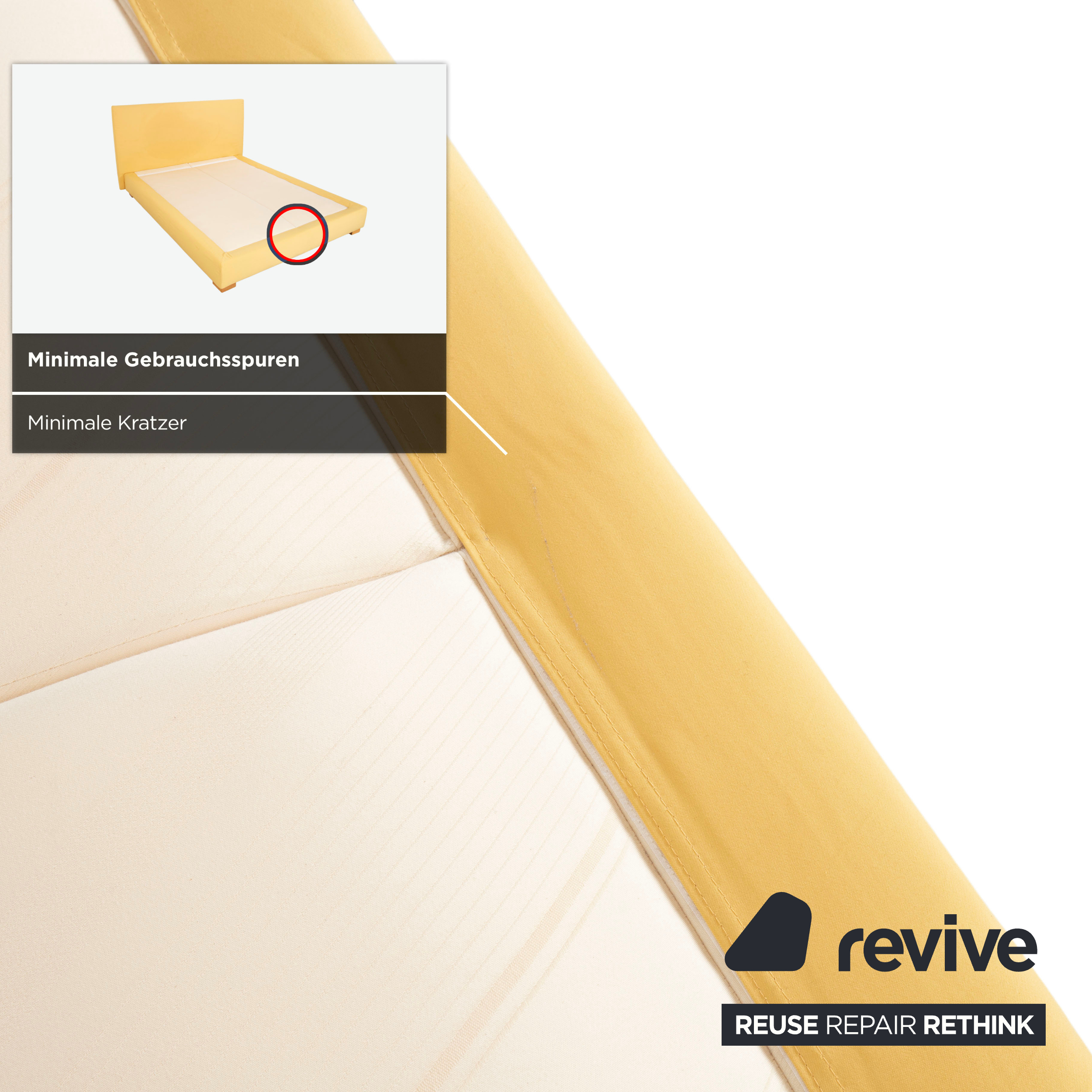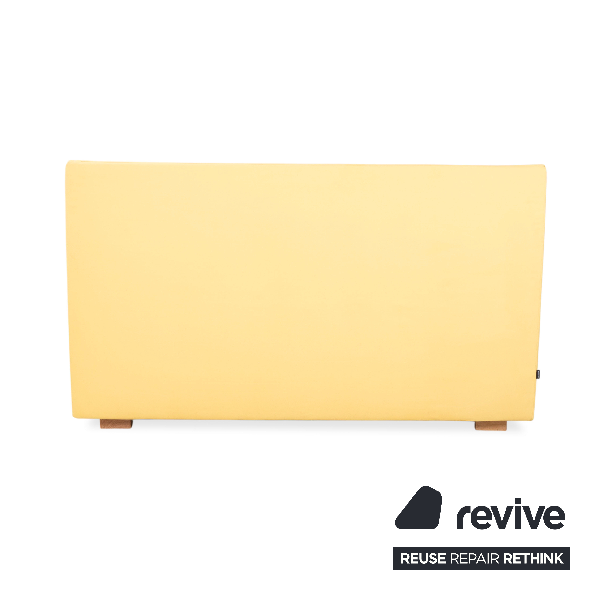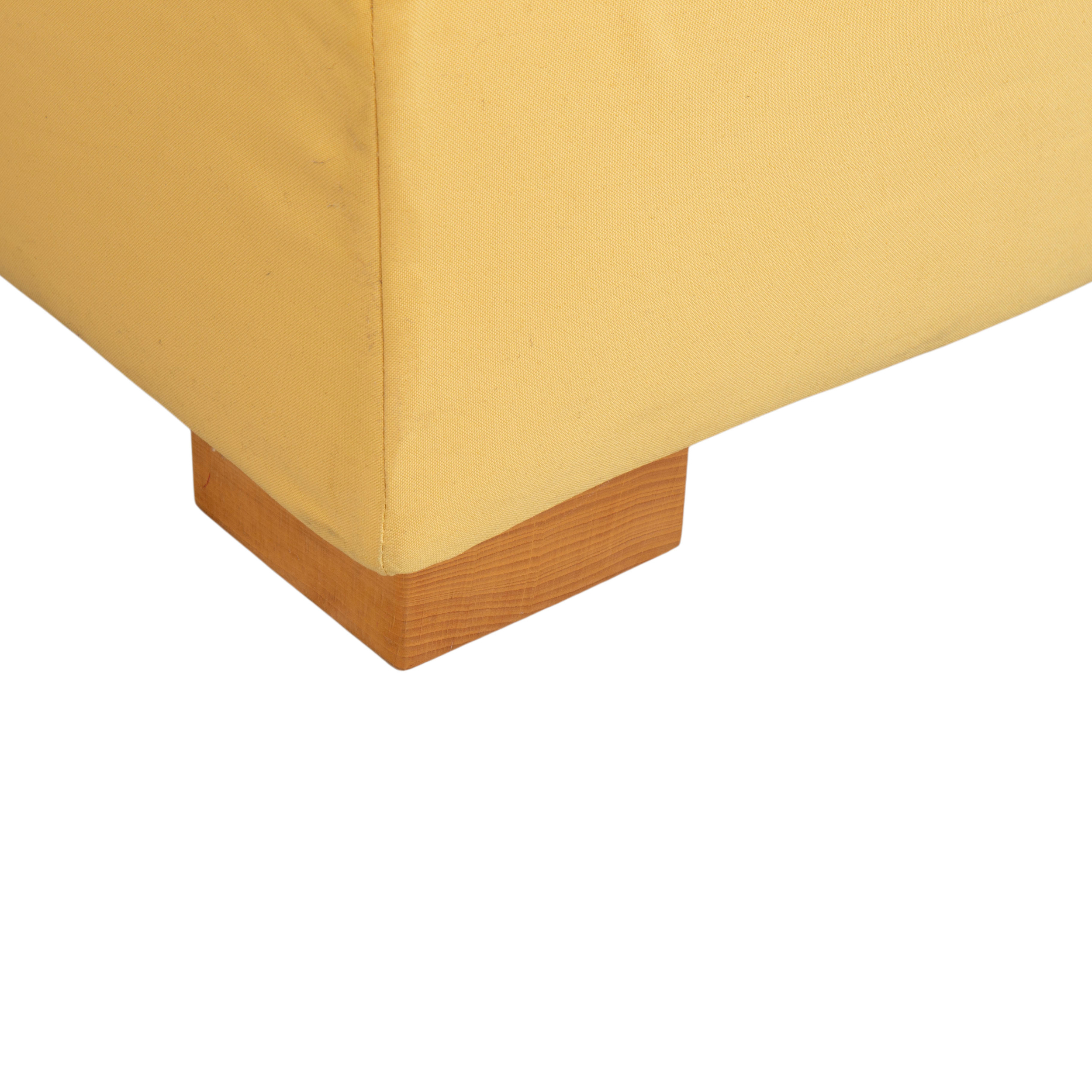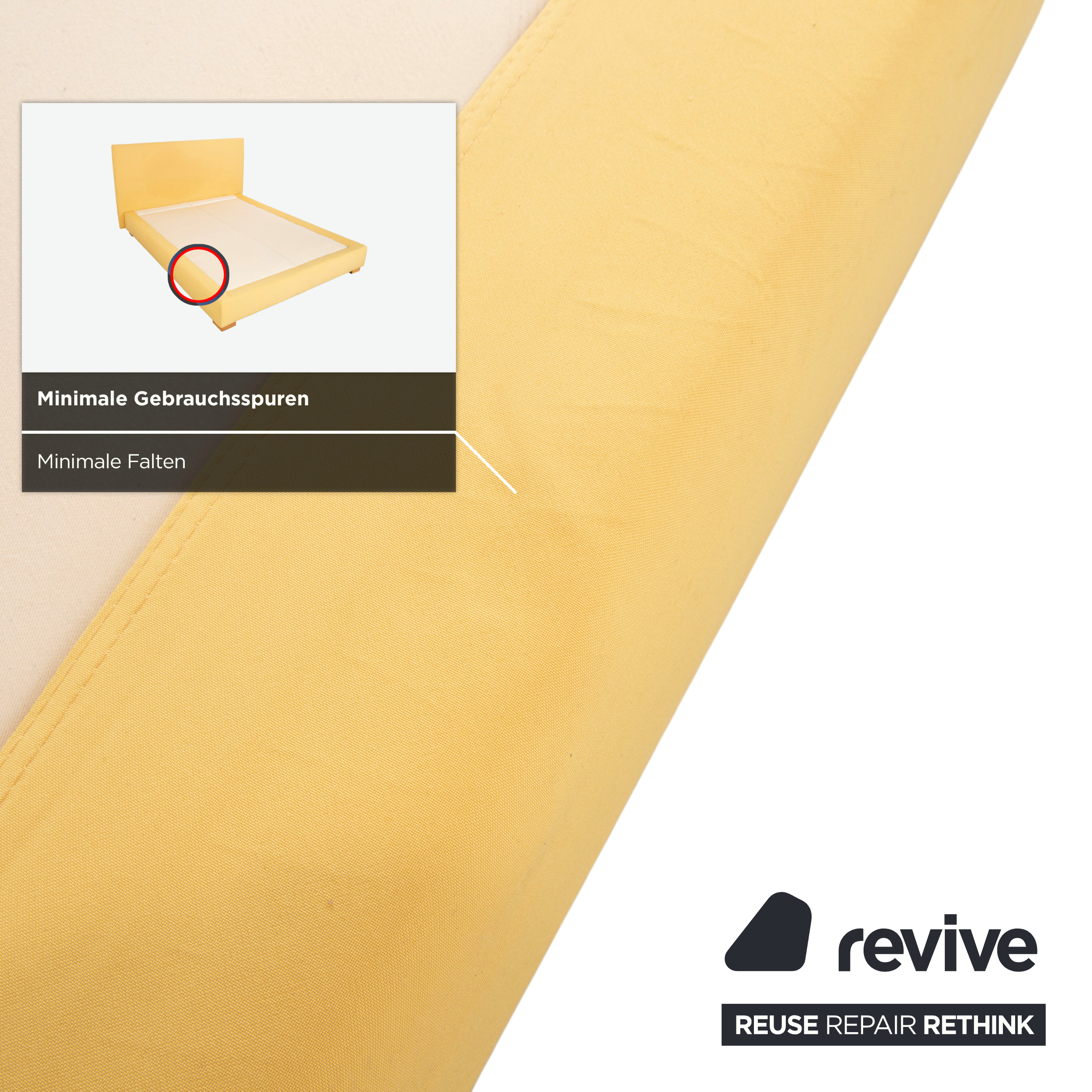 Auch der Bettrahmen ist vollständig mit dem gelben Stoff bezogen, was dem Möbelstück eine weiche, textile Anmutung verleiht. Getragen wird die Konstruktion von soliden, quadratischen Holzfüßen in einem natürlichen, hellen Holzton. Diese Blockfüße sorgen für Stabilität und unterstreichen den natürlichen, bodenständigen Charakter des Designs.