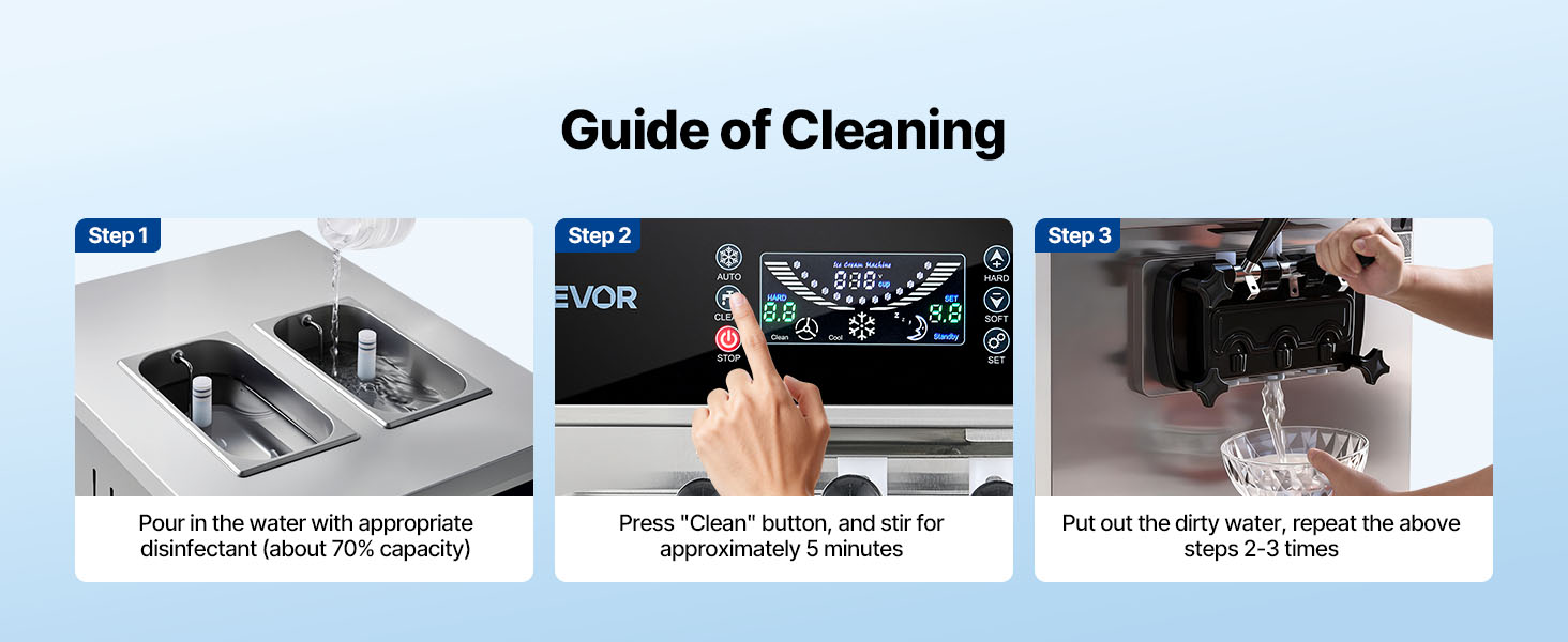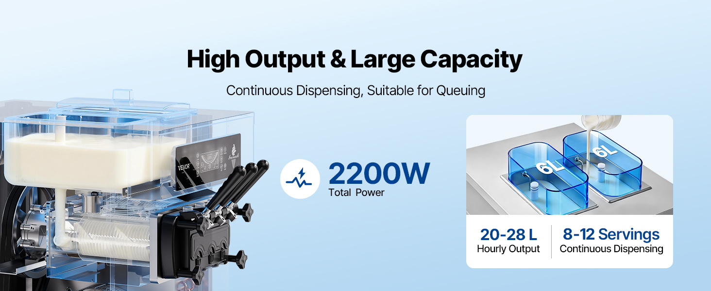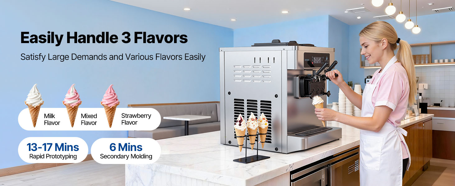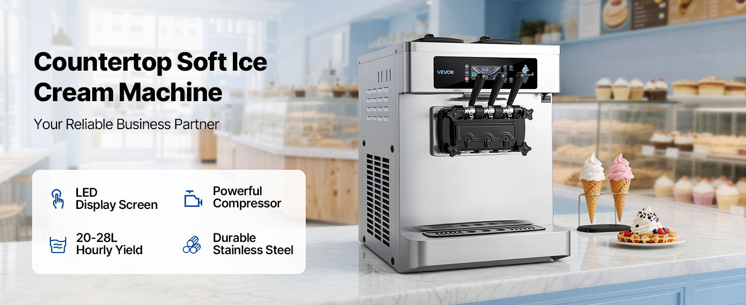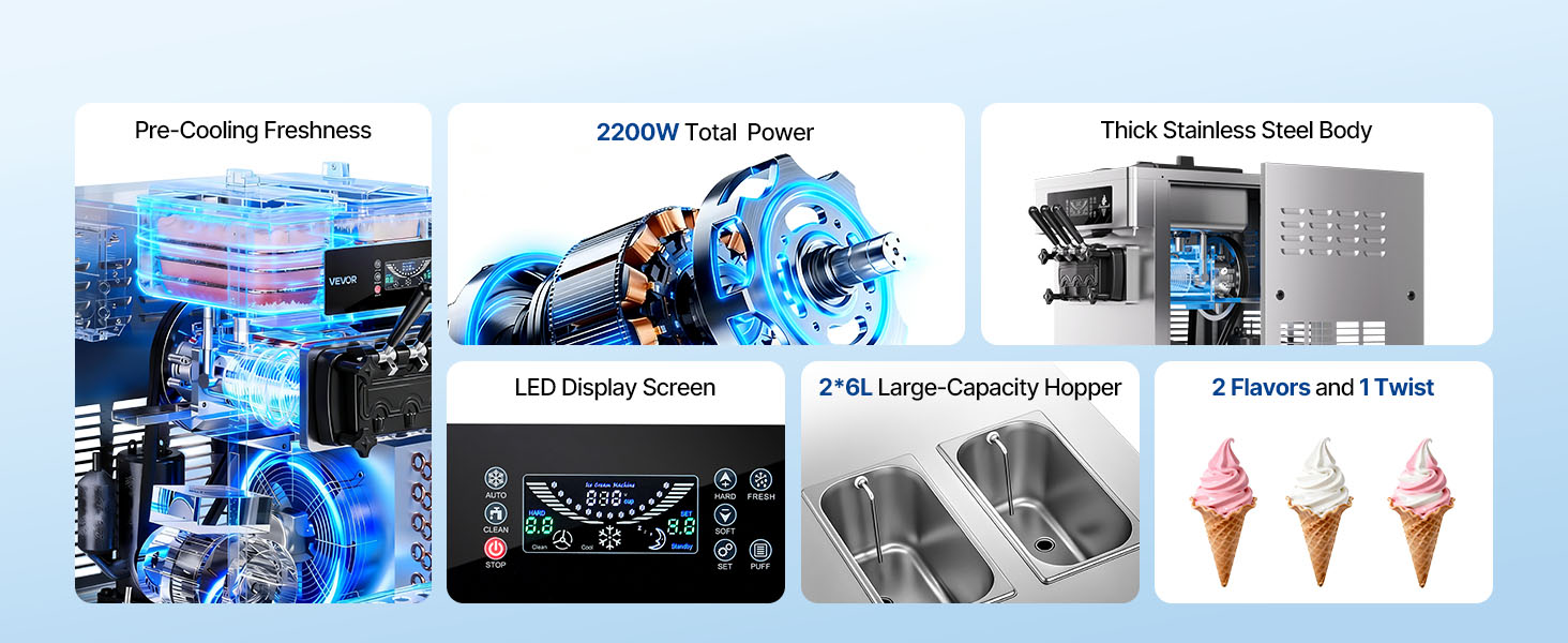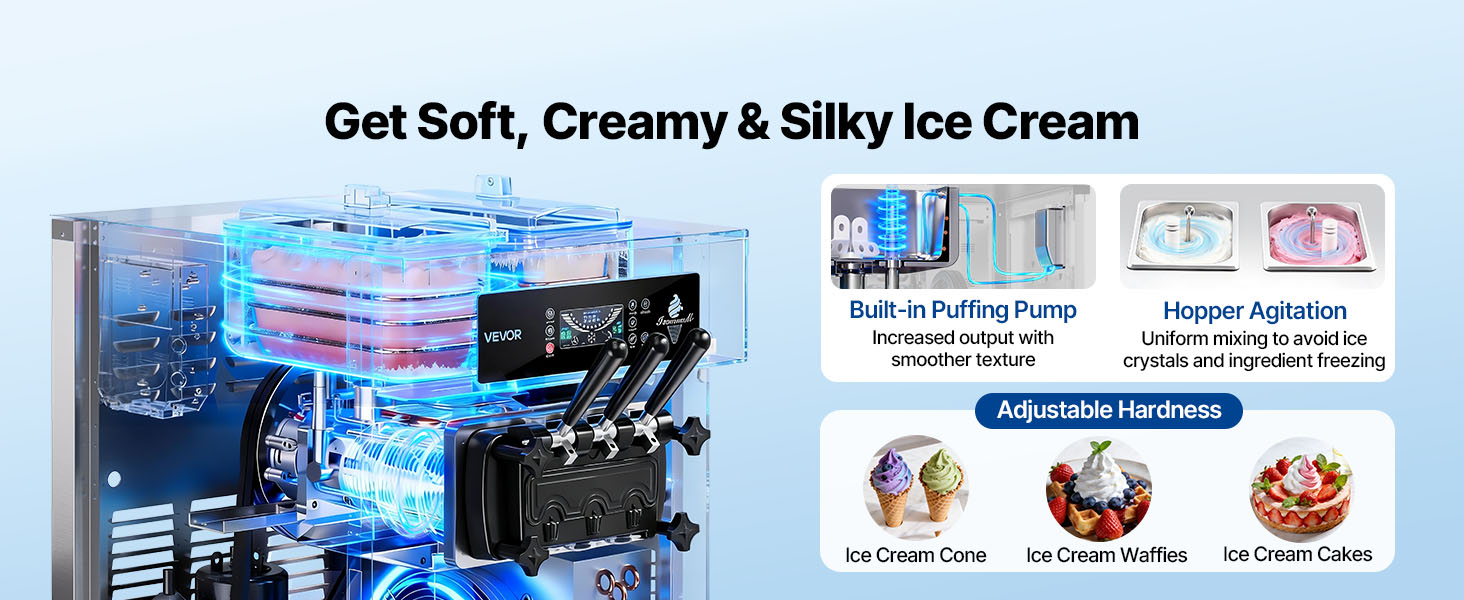 VEVOR commercial ice cream machine delivers up to 20–28 L/H while serving 3 flavors. Featuring pre-cooling preservation, a built-in puffing pump, hopper agitation and a high-perfomance compressor, it ensures smooth dispensing with a fine, uniform texture while maintaining efficient production.