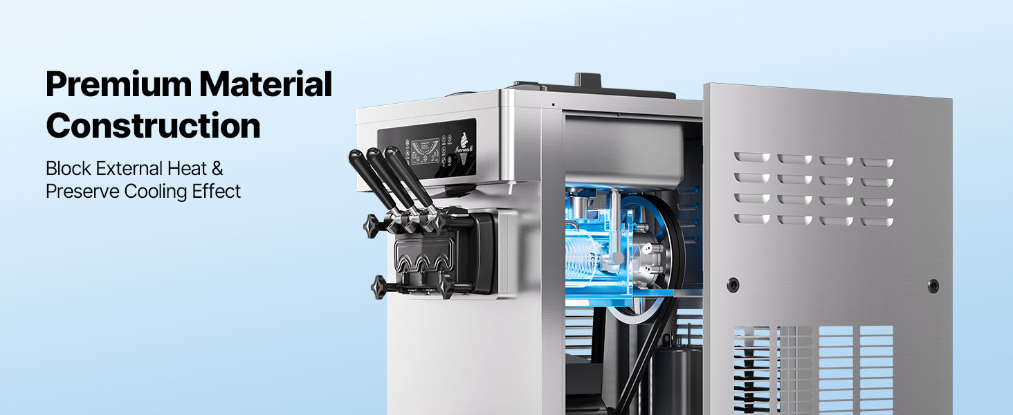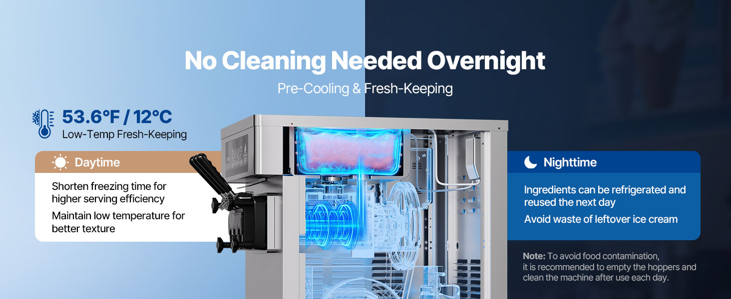 - Pre-Cooling Fresh-Keeping: VEVOR countertop commercial ice cream machine can produce up to 20-28L/H, delivering a continuous supply of 8-12 servings without interruption. Pre-cooling fresh keeping system pre-chills the mix to ≤53.6°F (12°C), ensuring it stays fresh and preventing spoilage even in high-temperature environments or during overnight storage