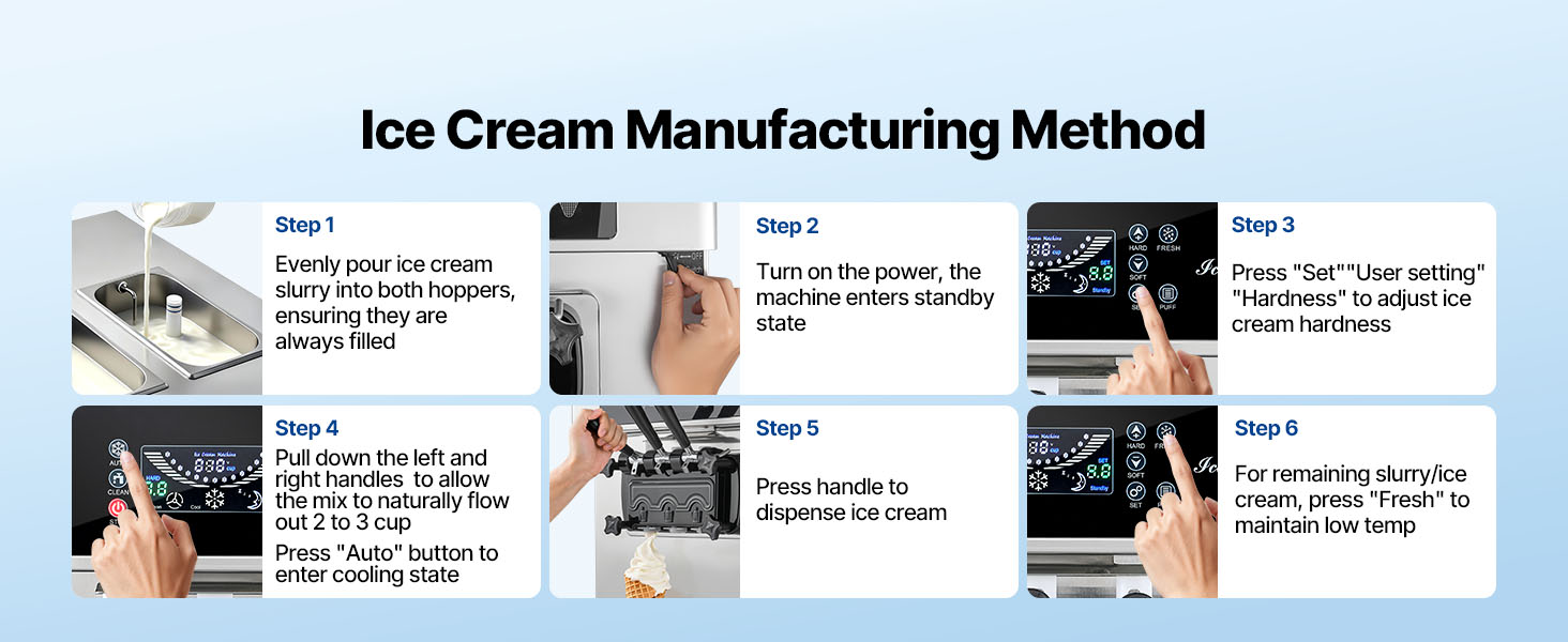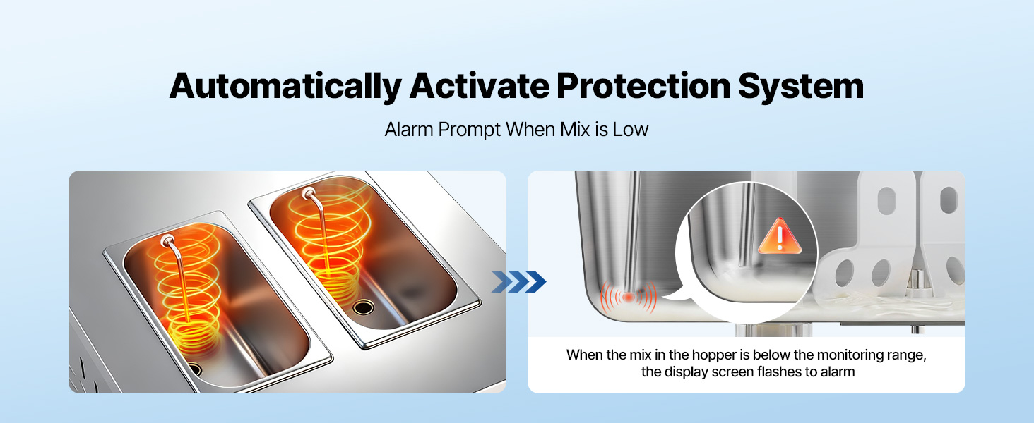 - Upgraded Puffing & Hopper Agitation: Compared to regular puffing rods (20–25% rate), our built-in efficient puffing pump achieves a 25–35% puffing rate and increases air incorporation, ensuring smoother dispensing and improved yield. Works together with hopper agitation to ensure more uniform texture without ice crystals