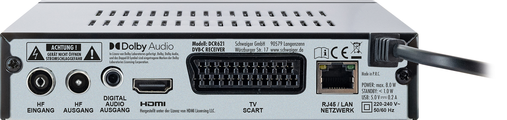 | Anschlüsse | 1x HF IN (Typ KOAX) 1x HF OUT (Typ KOAX) 1x USB 2.0 Anschluss 1x HDMI-Anschluss 1x SCART Anschluss 1x Digit. Tonausgang 1x Ethernet (RJ45) |