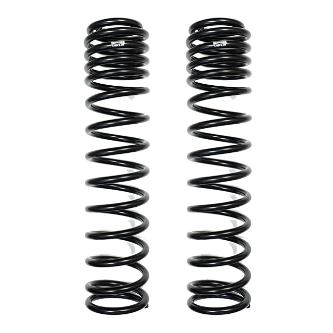 DUAL RATE-LONG TRAVEL COIL SPRINGS (Front Pair) for the 1997-2006 Wrangler and Wrangler Unlimited ensure superb highway ride quality and performance on any terrain both on-road or for off-road. The 1st spring rate offers an exceptional highway ride and as the coils expand when off-roading during articulation the suspension droops to keep the tires in contact with the ground much longer than a single rate coil. This results in a smoother ride while maintaining the coil in the upper coil bucket even at full droop. The 2nd rate (lower coils) only engage after compression past the 1st rate. This second rate allows consistent control and stability during body roll and heavy off-road suspension movement.