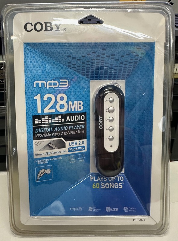 You are looking at a: New Coby MPC833 Silver/Black ( 128 MB ) Digital Media Player. This New Coby MPC833 Silver/Black ( 128 MB ) Digital Media Player is new and still in the original package. It is in good shape and still in the original plastic bag. Review the pictures for condition. It will be shipped in a new padded pack.