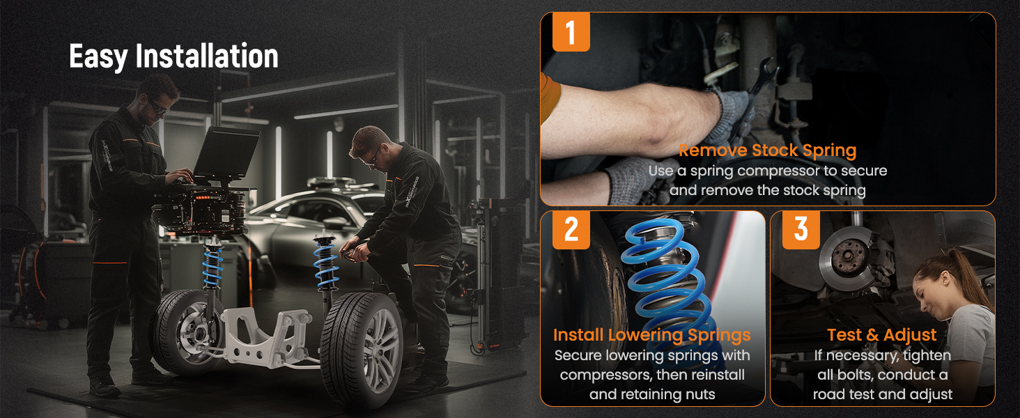Elevate your driving experience with our top-of-the-line lowering springs, designed for automotive enthusiasts who demand the highest standards in quality and reliability. Whether cruising through city streets or tackling rugged terrains, these springs offer superior ride comfort while enhancing your vehicle's stability and aesthetics.