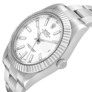 White dial with raised luminescent baton hour markers and hands. Date calendar at the 3 o'clock aperture.