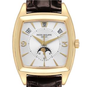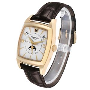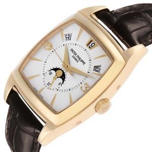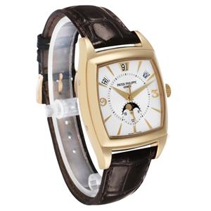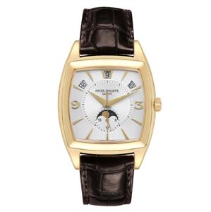 18K yellow gold tonneau-shaped case 51.0 x 38.0 mm. Transparent exhibition sapphire crystal caseback. Patek Philippe logo on the 18k yellow gold crown. |