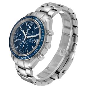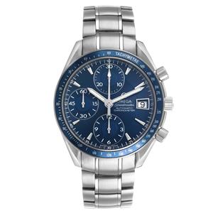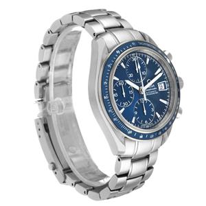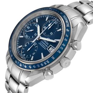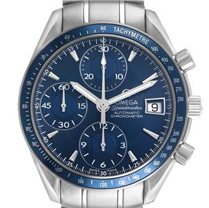 Blue dial with steel index hour markers and luminscent baton hands. Three chronograph subdials -- a small seconds counter, 30-minute recorder, and 12-hour recorder. Date window at 3 o'clock. |