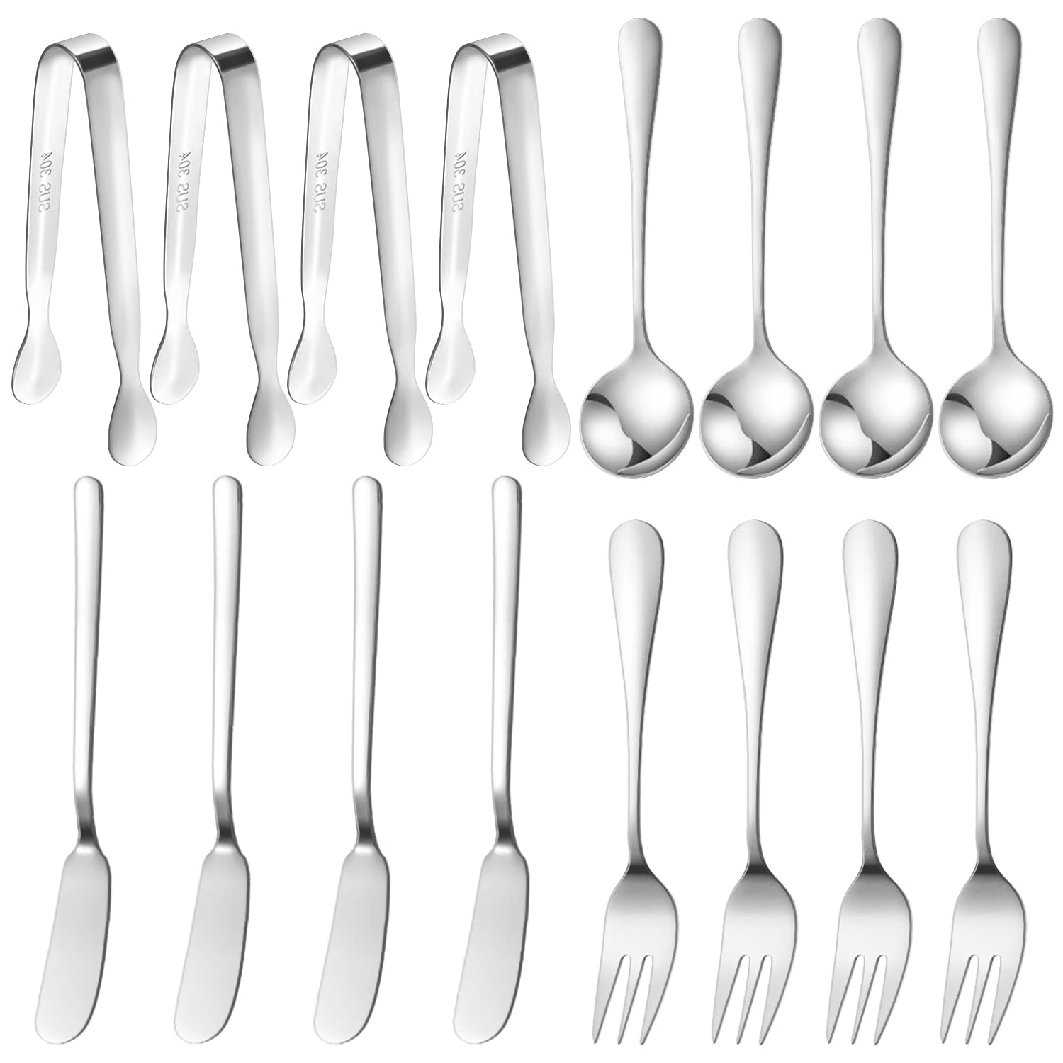 - ćEnough quantityć: Set includes 4 pieces cheese butter spreader knives, 4 pieces mini serving tongs, 4 pieces small spoons and 4 pieces small forks, which are made of high-quality stainless steel and advanced integrated process technology, exquisite and durable. The set can be used for cheese, butter, jam, peanut butter, pastries, watermelon, appetizers, pickle, charcuterie. It is an excellent kitchen gadget. Can be shared with relatives, friends and neighbors as gifts, and will be praised.