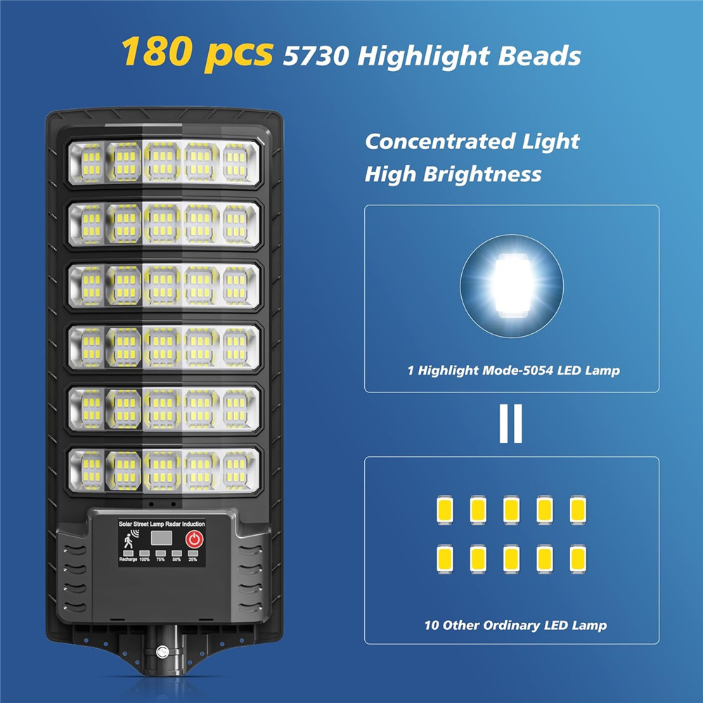 Super Bright & Wide-Angle Illumination: Our solar street light features 180 high-brightness 5730 Type LED beads, delivering exceptional brightness with energy efficiency. The integrated wide-angle design provides a 5-sided illumination range, covering an area of 323-431 sq. ft. for optimal lighting performance, ensuring bright and consistent illumination across large outdoor spaces.