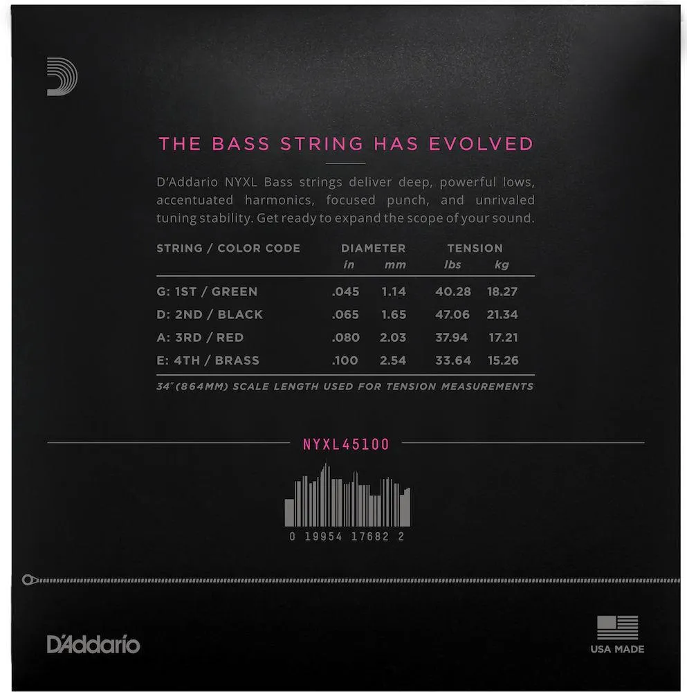 D’Addario has rebuilt the electric bass string to bring more sonicpossibilities to bass players. NYXL Bass combines our high carbon NYSteel core and up to three wraps of our reformulated nickel-platedsteel in new core-to-wrap ratios. This advanced construction providesmore dynamic range and sustain than any other bass string. Meticulouslydesigned for all playing styles, this string features deep, powerfullows with focused punch, increased dynamics, and accentuated harmonicresponse.