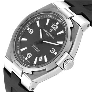 Black rubber strap with a stainless steel deployant clasp with a Vacheron Constantin logo on the tang buckle. |